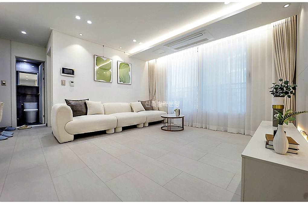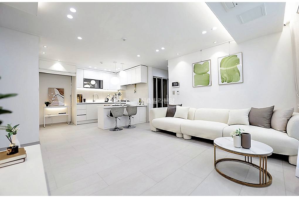 전체적으로 인테리어가 세련된 느낌이라 어떤 소파를 놔도 잘 어울릴 것 같죠.