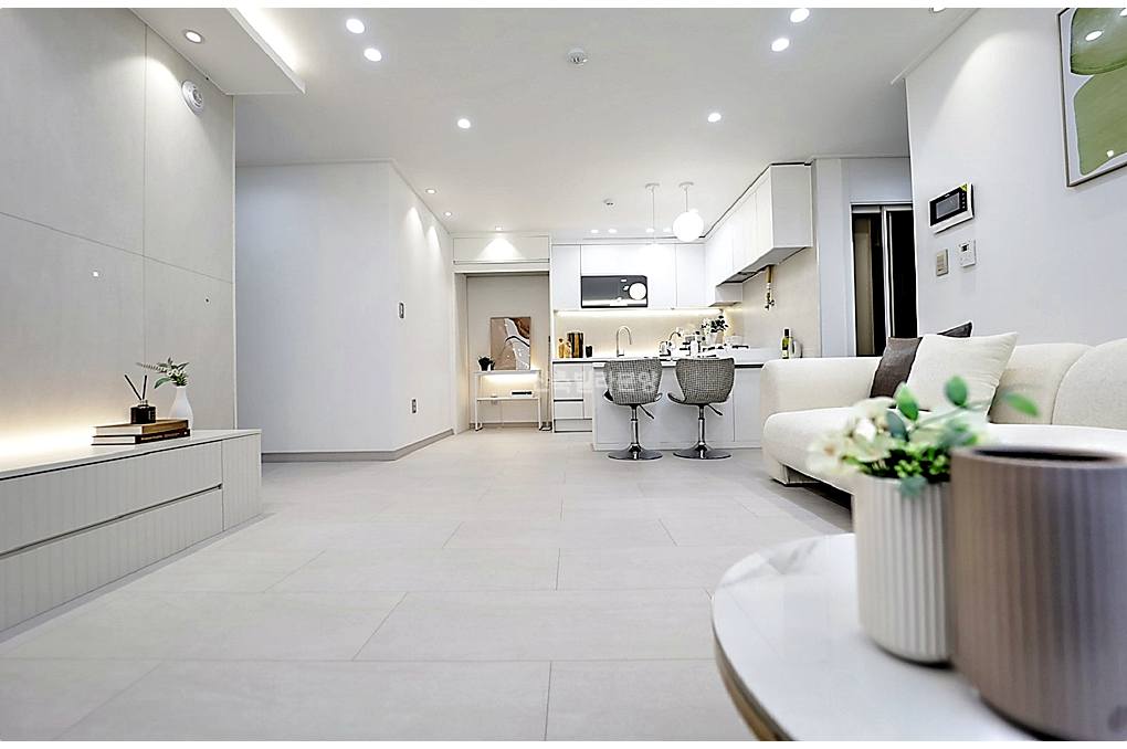 주방이랑 일자로 쭉 뻗은 오픈형 구조라서 집이 실제보다 훨씬 넓어 보이더라고요.