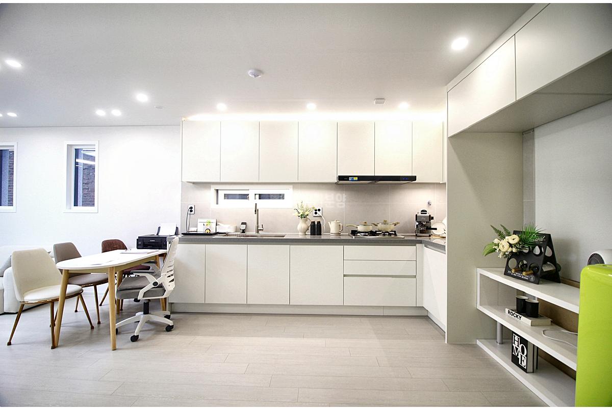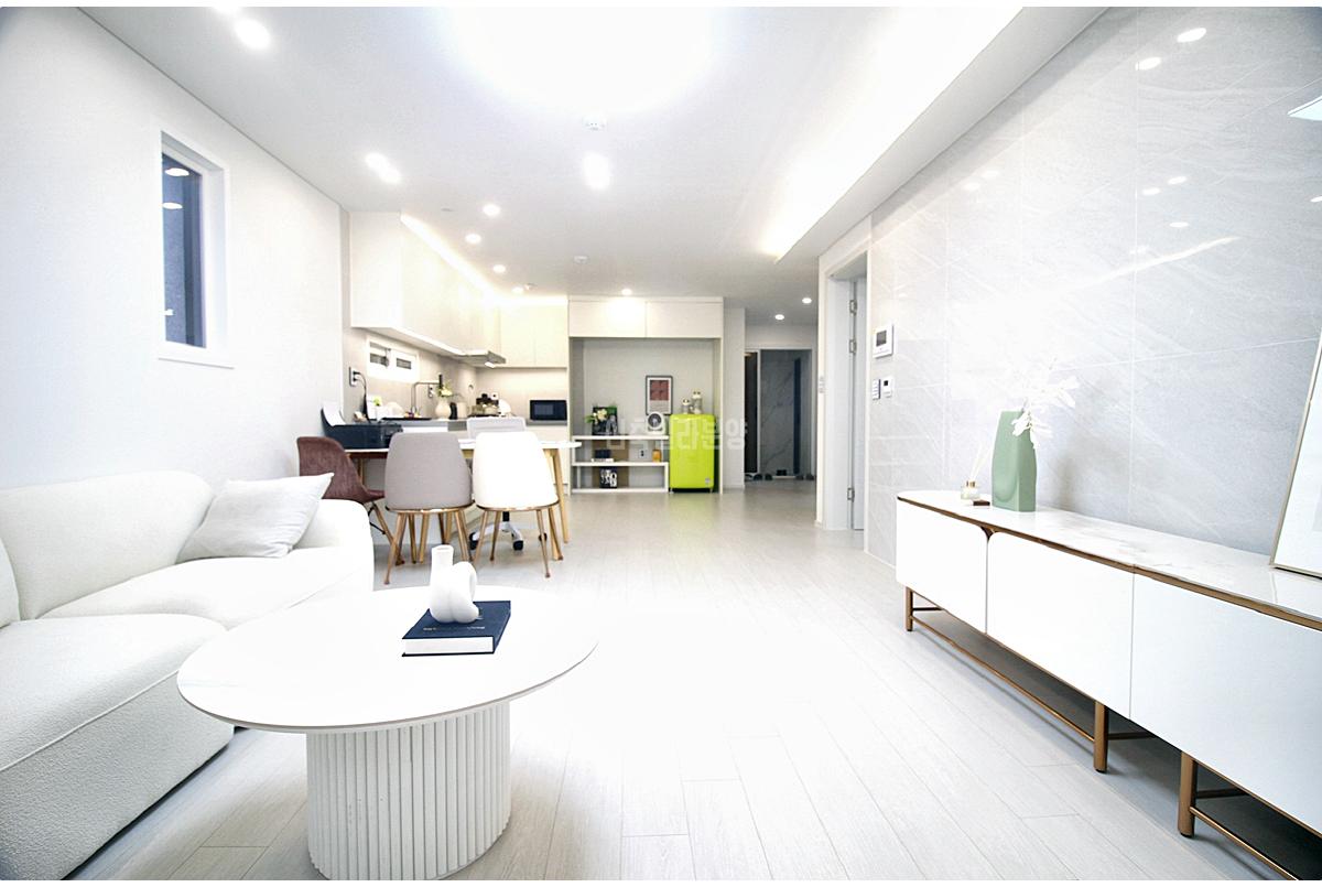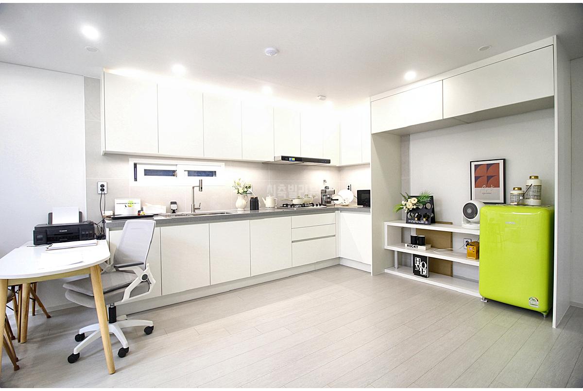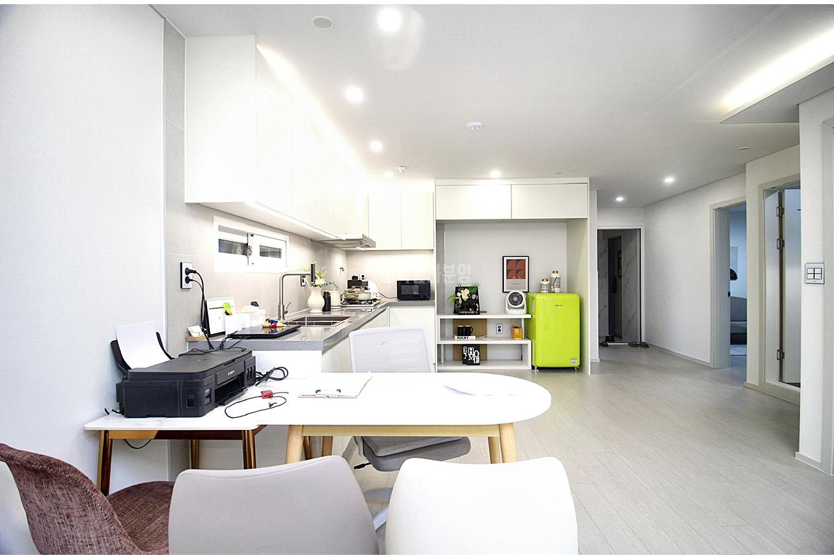 세류동신축빌라 아이보리 톤의 화사한 인테리어로 시공된 거실은 실제 면적보다 훨씬 넓어 보이는 개방감을 선사합니다. 주방은 효율적인 ㄱ자 동선으로 설계되었으며, 4인용 식탁 공간과 냉장고 박스가 깔끔하게 마련되어 있습니다.