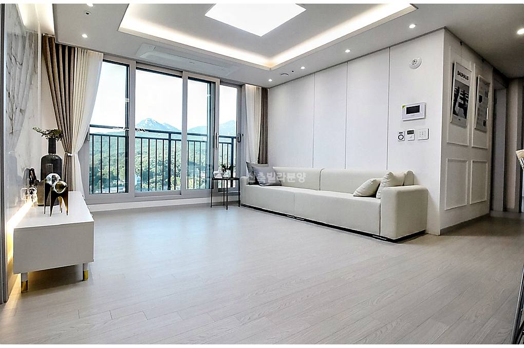 특히 거실은 우물형 천장 설계와 간접 매립등 덕분에 층고가 한층 더 높아 보이고 대형 창호를 통해 들어오는 채광이 안방까지 깊숙하게 전달되는 4베이 구조의 장점을 여실히 보여주었는데요.