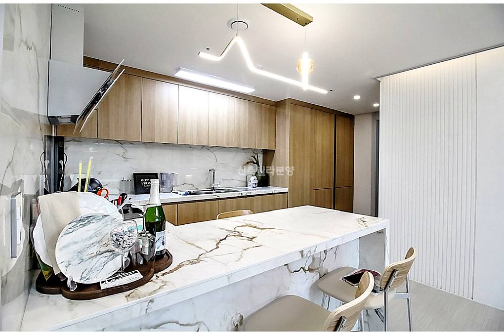 주방은 ㄷ자형 구조에 아일랜드 식탁을 더해 요리 동선을 최적화했으며, 세련된 대리석 패턴 타일로 마감되어 기름때 관리도 무척 쉬워 보였습니다.