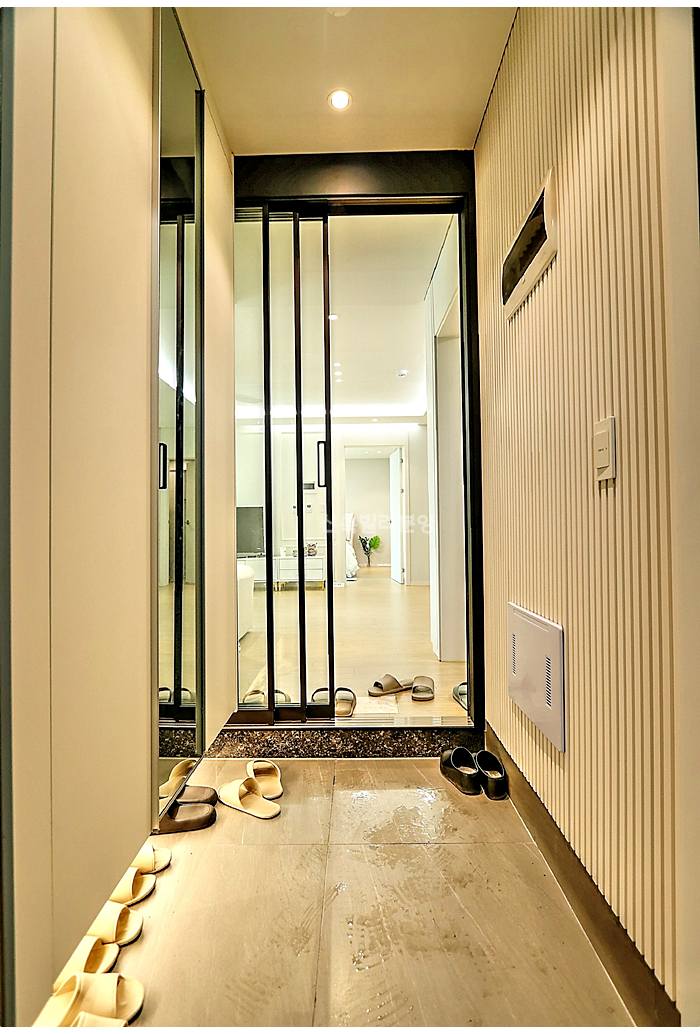1층 자주식 주차장은 공간이 꽤 넉넉해서, 늦게 귀가해도 주차 전쟁 치를 일은 없겠어요. 현관 중문 디자인도 꽤 고급스러운 편이죠.