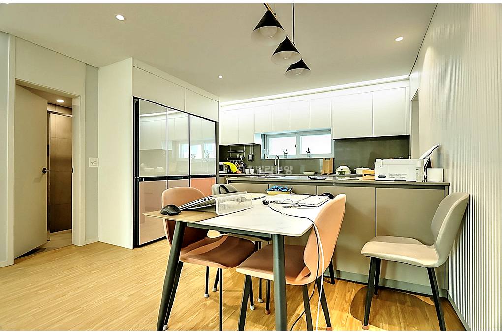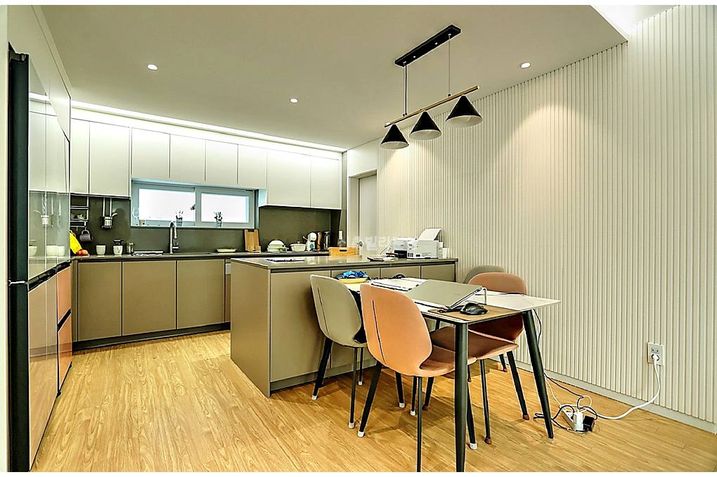 고읍동신축빌라 ㄱ자 싱크대에 아일랜드 식탁이 따로 있는 게 직접 서 보니까 동선이 참 깔끔하게 나와요. 식탁 자리가 별도로 마련된 점도 좋네요.