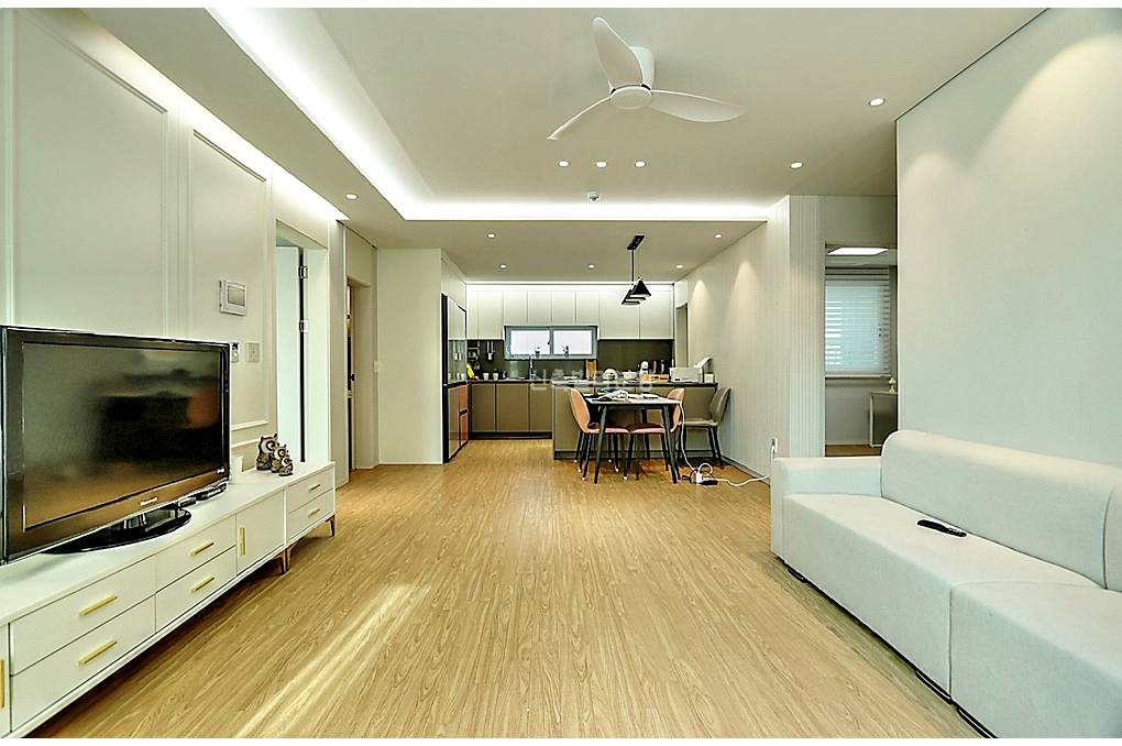 거실이랑 주방이 일자로 쭉 뻗은 구조라서 아이들이 뛰어노는 모습도 한눈에 들어오고, 바람도 잘 통해서 집 안이 참 쾌적해요.