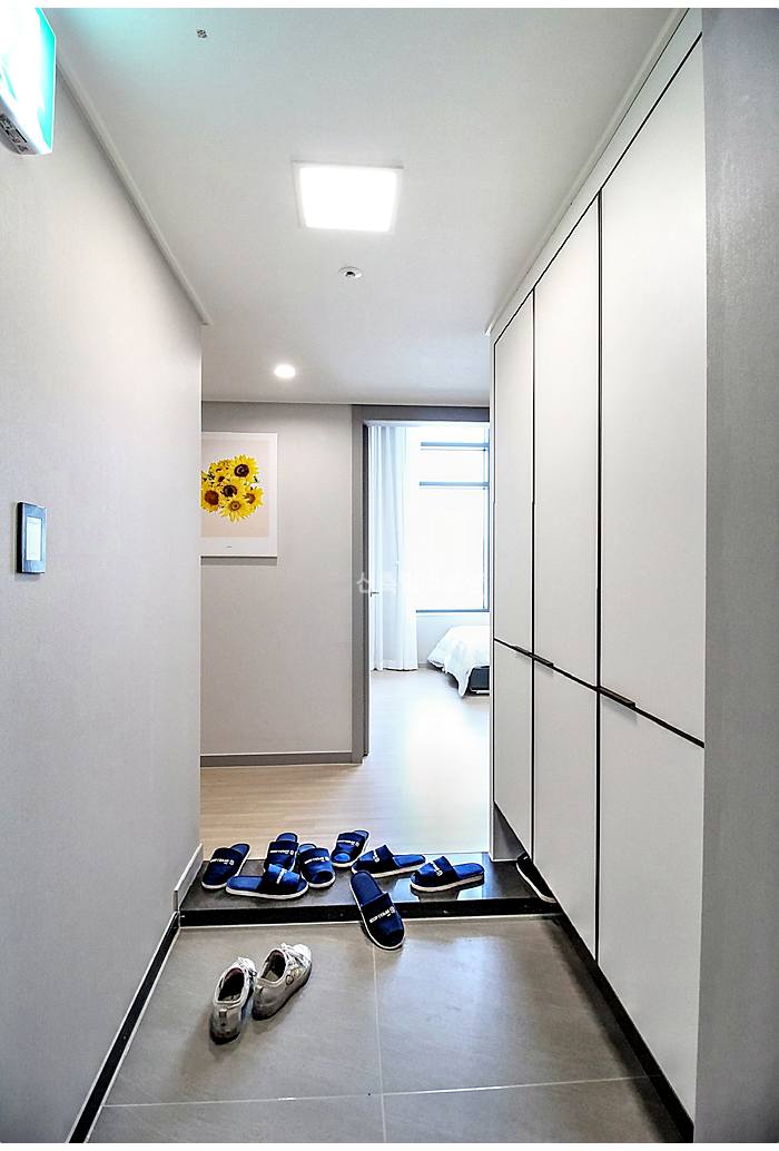 전농동신축빌라 현관은 화이트 대형 신발장과 일괄소등 스위치가 자리하고 있어요.