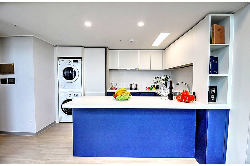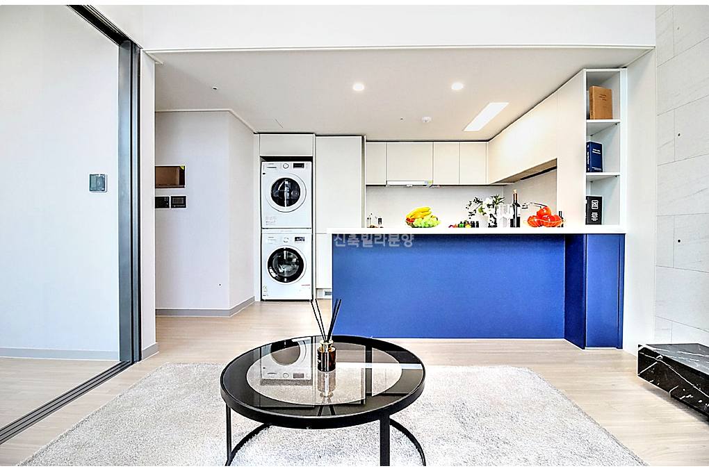 동대문구신축빌라 네이비 컬러 아일랜드가 주방 전체의 분위기를 잡아주는 구성이에요.