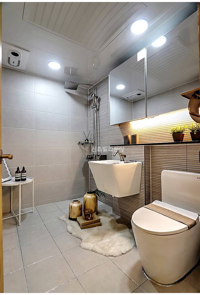 화성신축빌라 욕실은 한마디로 깔끔함 그 자체예요. 그레이톤의 고급스러운 타일 마감이 집 전체 분위기와 아주 잘 어울리죠.