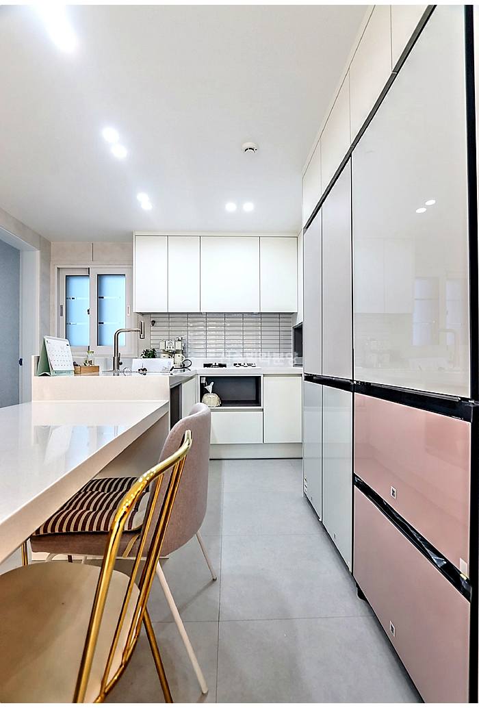 양문형 냉장고와 김치냉장고가 무상이고요. 거실과 안방 등 총 3대의 시스템 에어컨이 설치되어 별도의 혼수 가전 걱정이 없답니다.