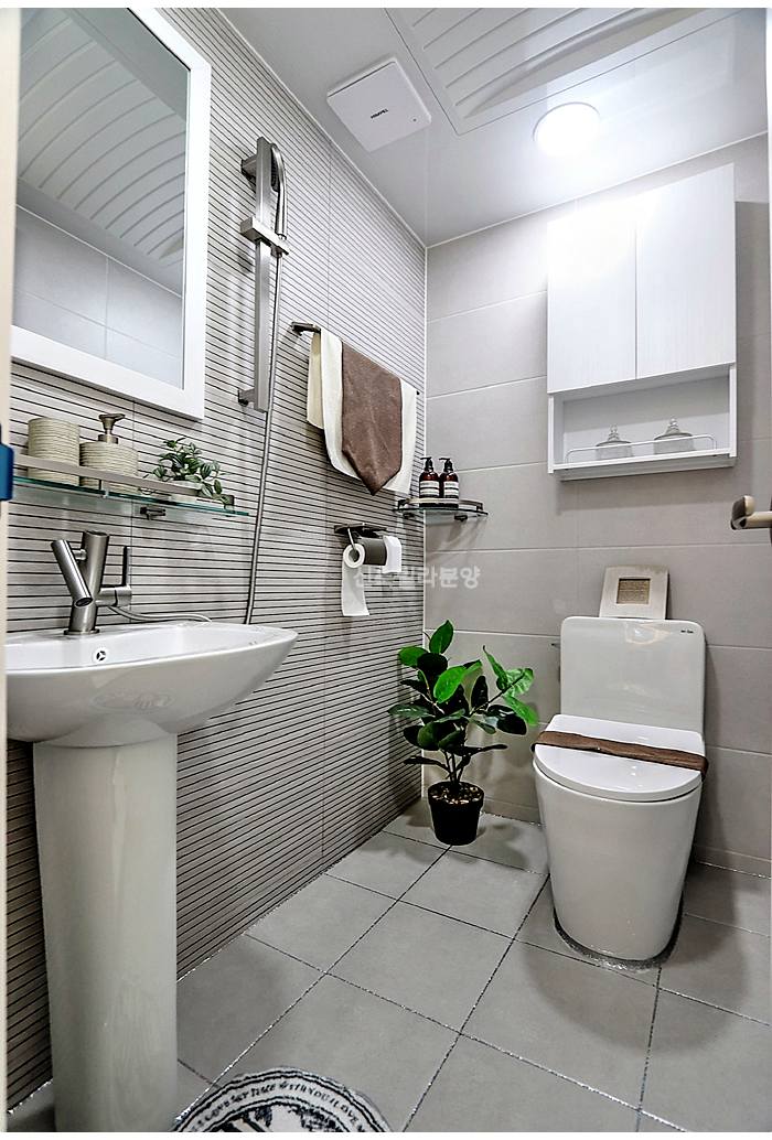 화성신축빌라 욕실은 한마디로 깔끔함 그 자체예요. 그레이톤의 고급스러운 타일 마감이 집 전체 분위기와 아주 잘 어울리죠.