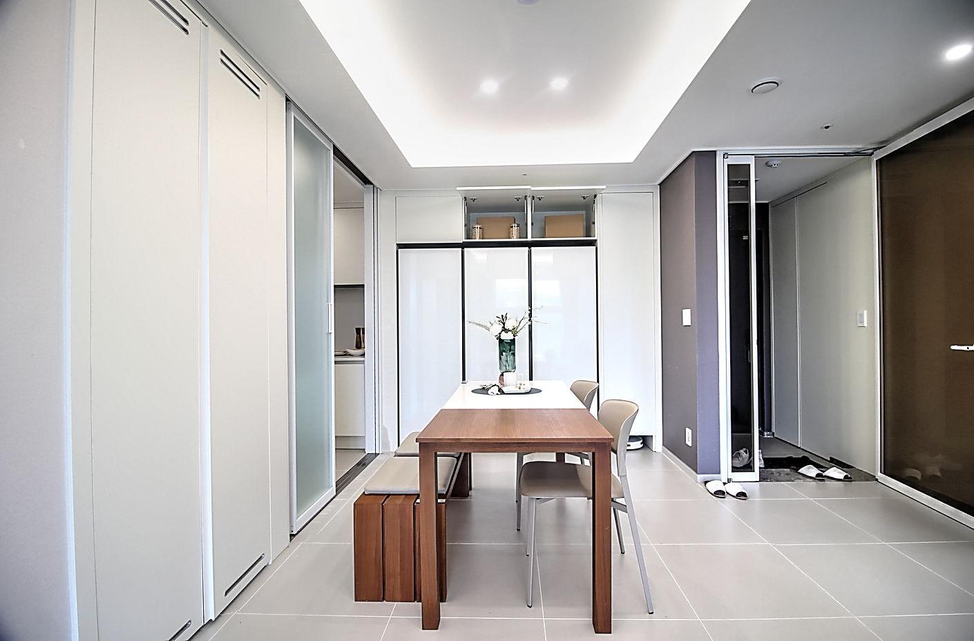 주방은 투룸 구조에서 흔히 보기 어려운 넓은 공간을 확보했습니다. 식탁을 별도로 배치할 수 있는 여유 공간이 있어, 요리와 식사, 티타임이 하나의 장소에서 자연스럽게 이어집니다. 비스포크 가전들이 일렬로 정돈된 모습은 기능성과 미학을 동시에 충족합니다.