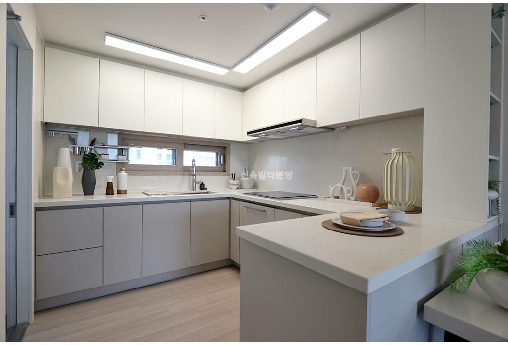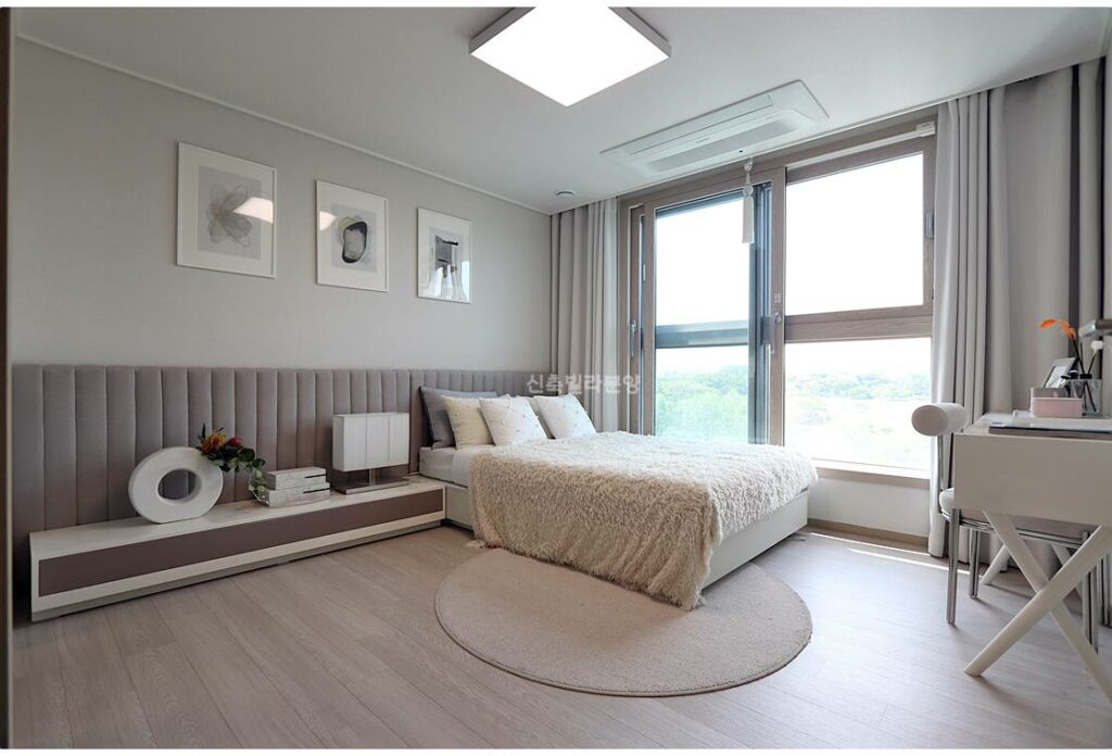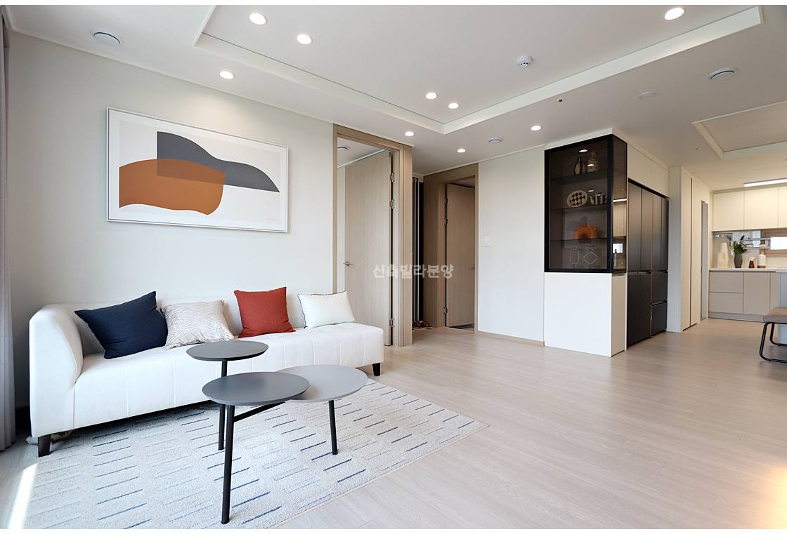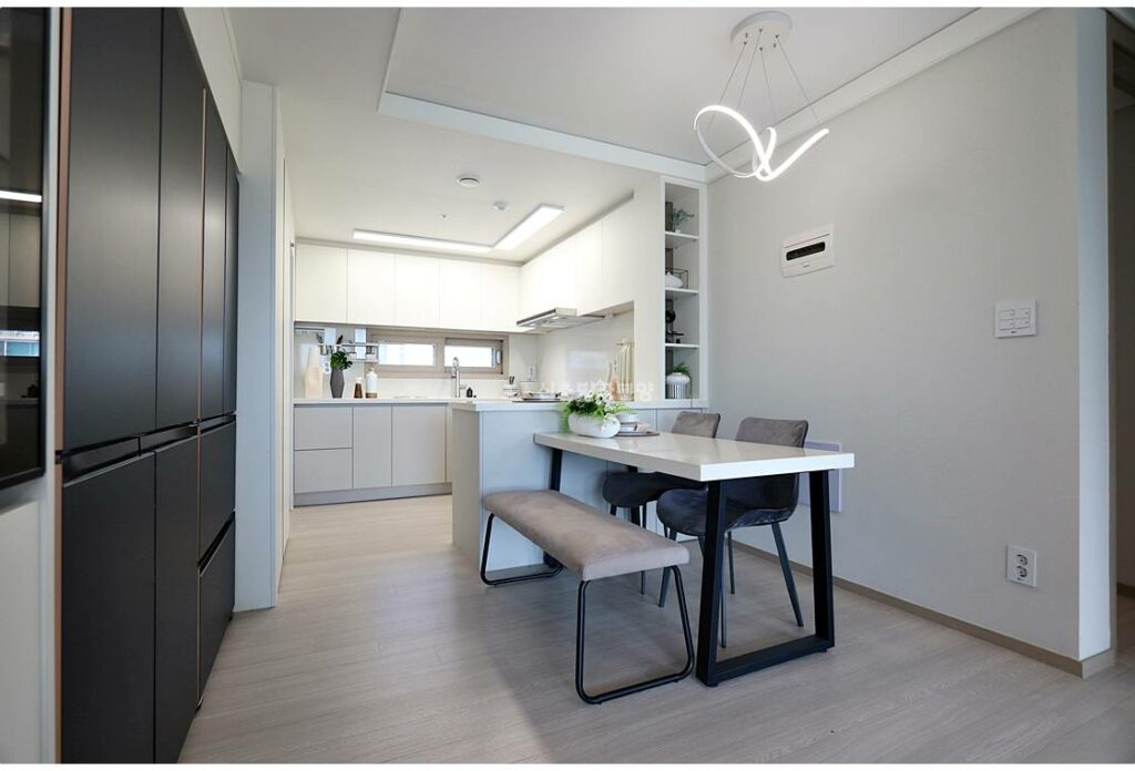안방-거실-방 순서로 배치된 3BAY 설계는 프라이버시와 채광을 동시에 잡았습니다. 안방은 약 12평 규모로 넉넉하며, 나머지 방들도 10평대로 아이방이나 서재로 충분합니다. 작은방에는 발코니가 딸려 있어 공간 활용도가 높습니다. 오픈형 주방은 ㄷ자 구조에 아일랜드 식탁까지 갖춰 가족 모임에 최적화되어 있습니다.