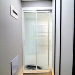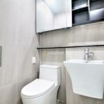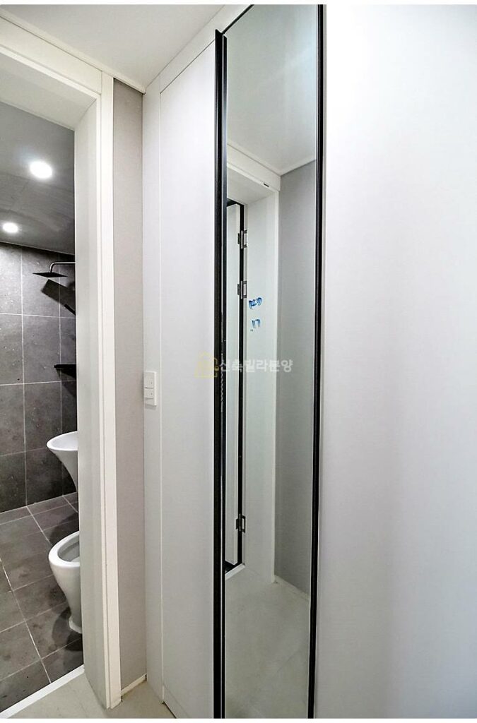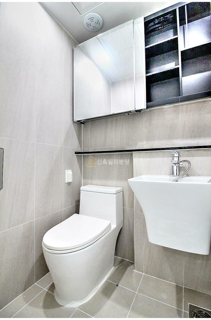 화장실 두 곳 모두 슬라이딩 방식의 거울장이 설치되어 있어요. 젠다이 형식의 선반과 모서리 수납공간까지 있어서 세면도구나 화장품 보관이 편리하죠.