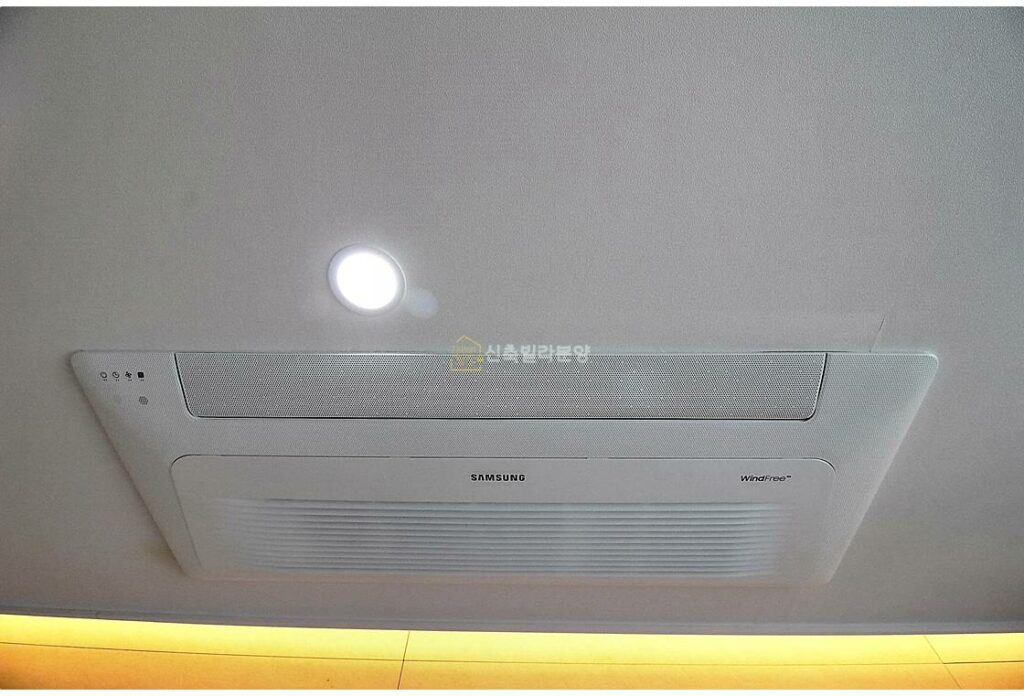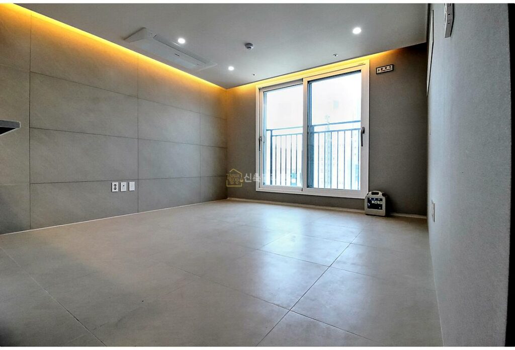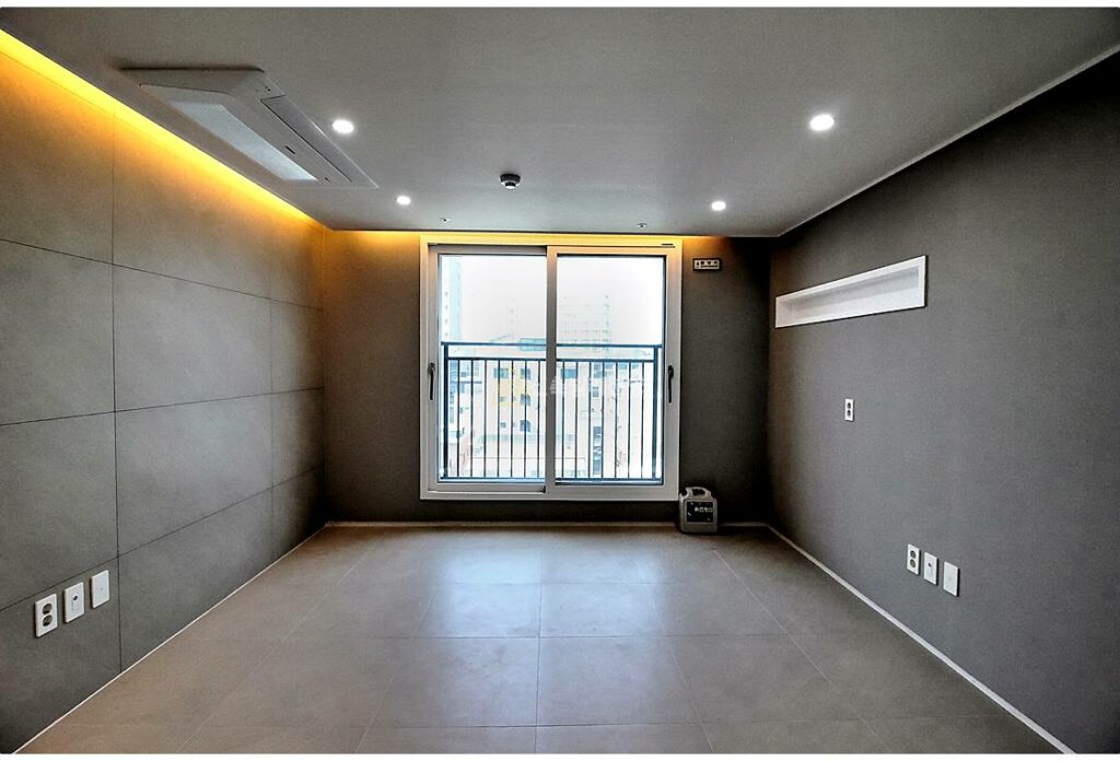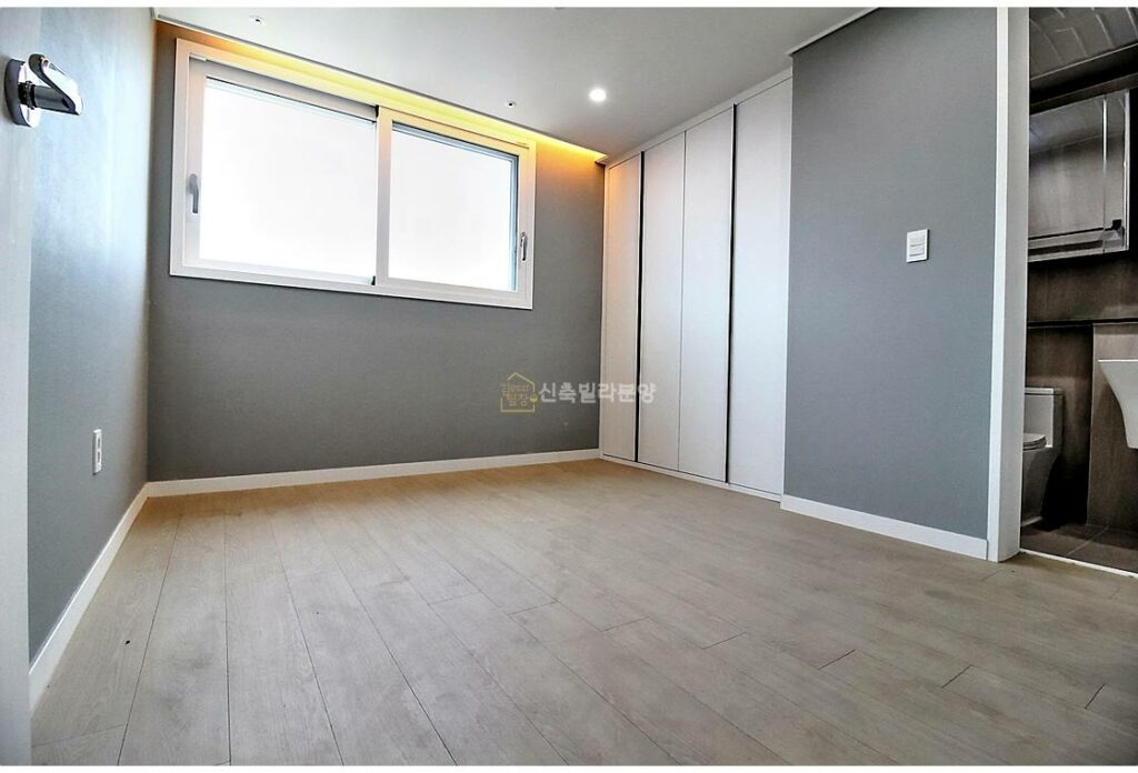 큰 침실에는 수납장이 벽면에 설치되어 있고, 냉난방기도 갖춰져 있어요. 침대만 들여놓으면 바로 생활 가능한 상태죠.