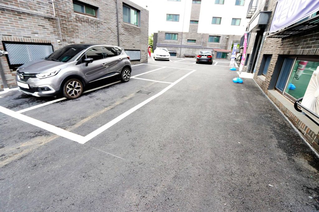 일렬주차방식으로 구성되어 있는 지상주차장의 모습입니다.