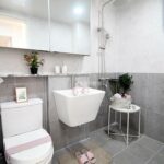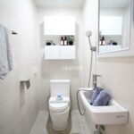 메인 욕실은 깔끔한 타일 마감으로 시공되었으며, 기본 위생 설비가 잘 갖춰져 있습니다. 다만 샤워 공간에 파티션이 설치되지 않은 점은 참고할 필요가 있습니다. 안방 전용 욕실은 다소 작은 크기이지만, 샤워기가 설치되어 있어 실용성을 확보했습니다.