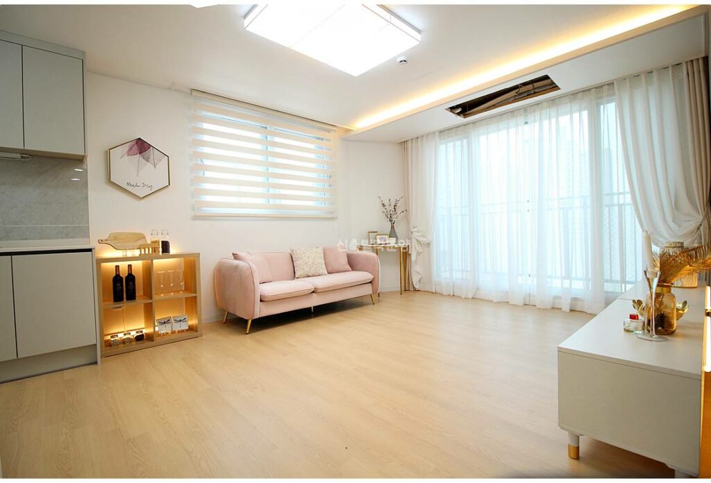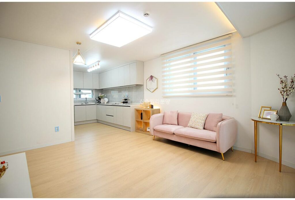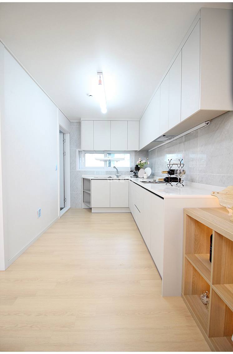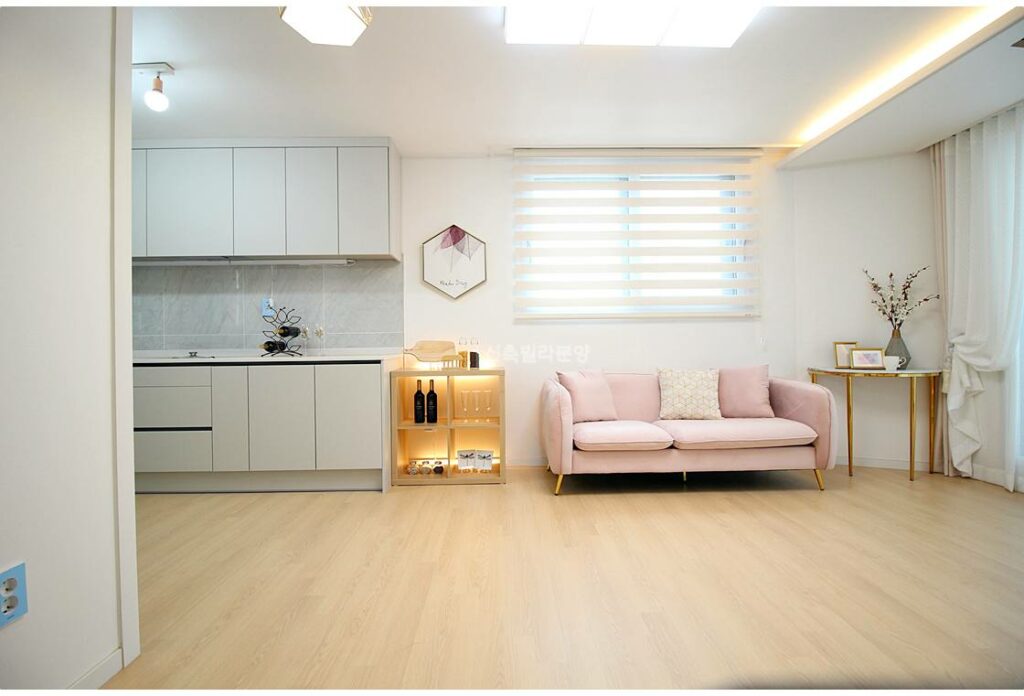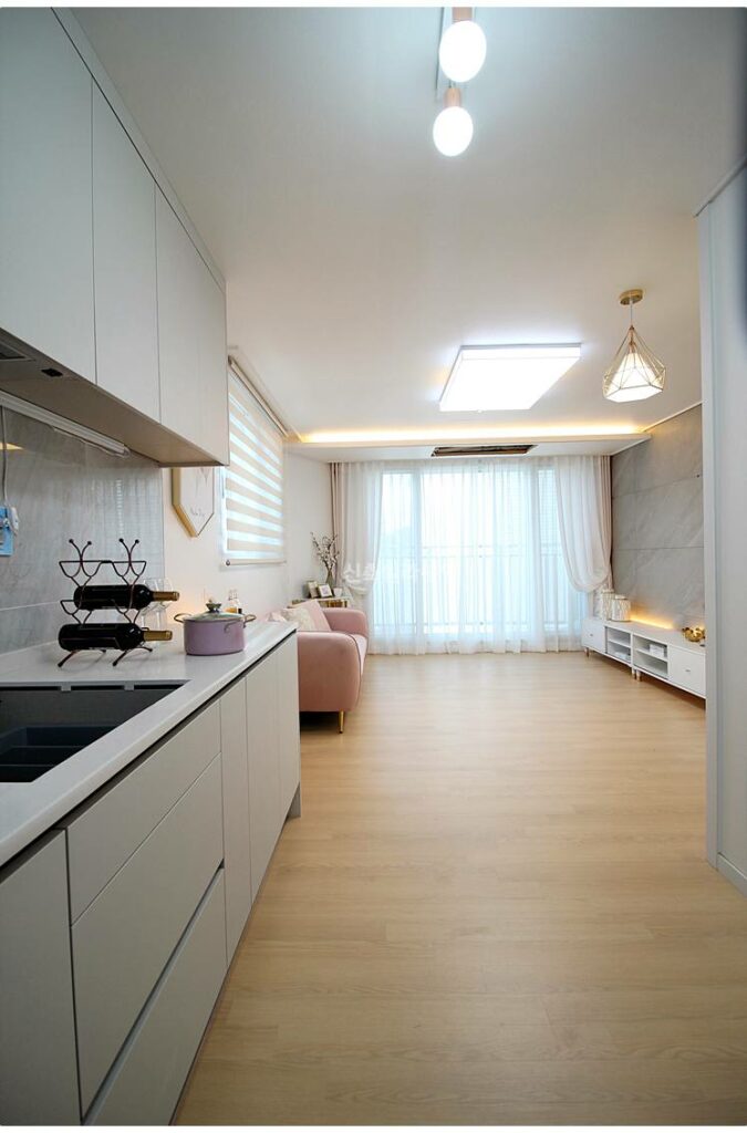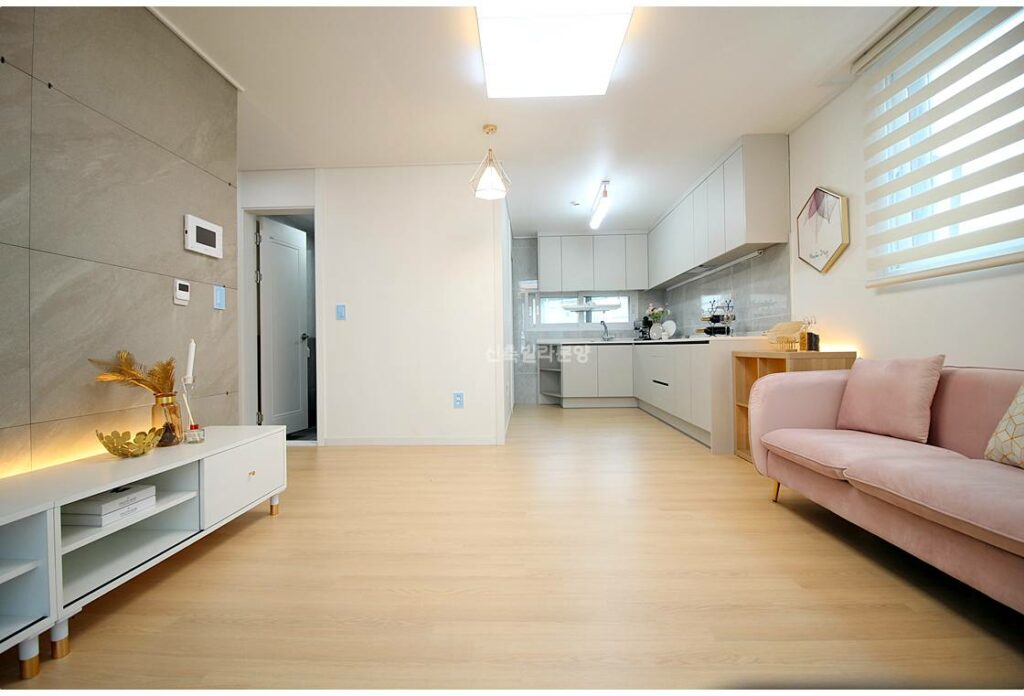 거실은 따뜻한 분위기의 우드톤 강마루로 마감되어 있으며, 라인 조명이 설치되어 은은한 무드를 연출합니다. 천장에는 시스템 에어컨이 기본 옵션으로 포함되어 냉난방 비용 부담을 줄일 수 있습니다. 주방은 ㄱ자 형태로 효율적으로 설계되었고, 냉장고 공간이 별도로 확보되어 있습니다. 주방 인접 공간에 다용도실이 배치되어 수납 공간 활용도가 높습니다.