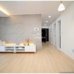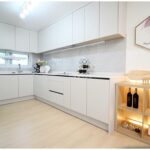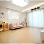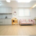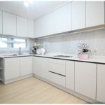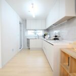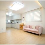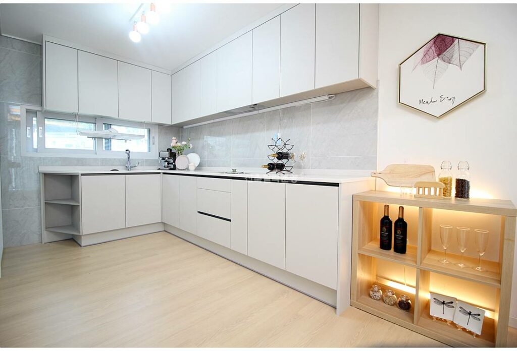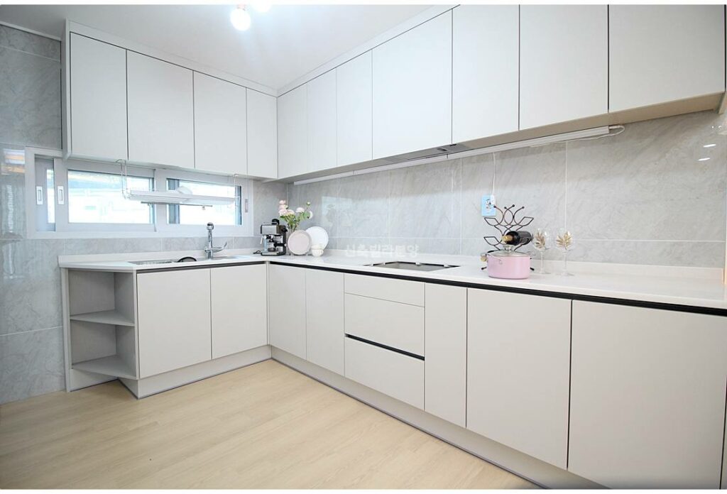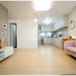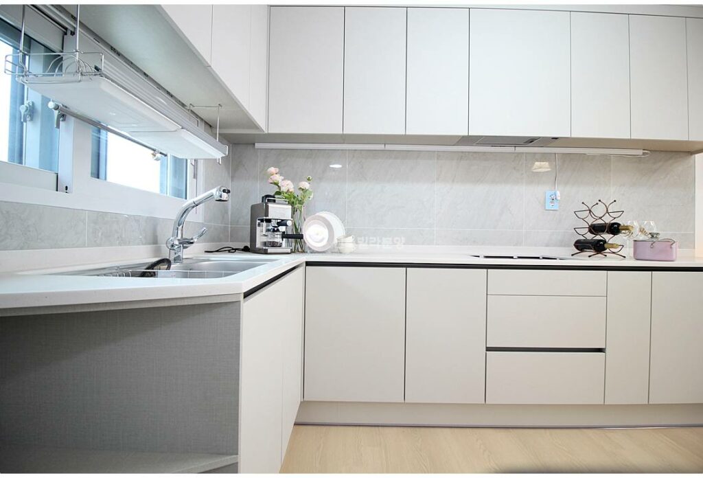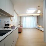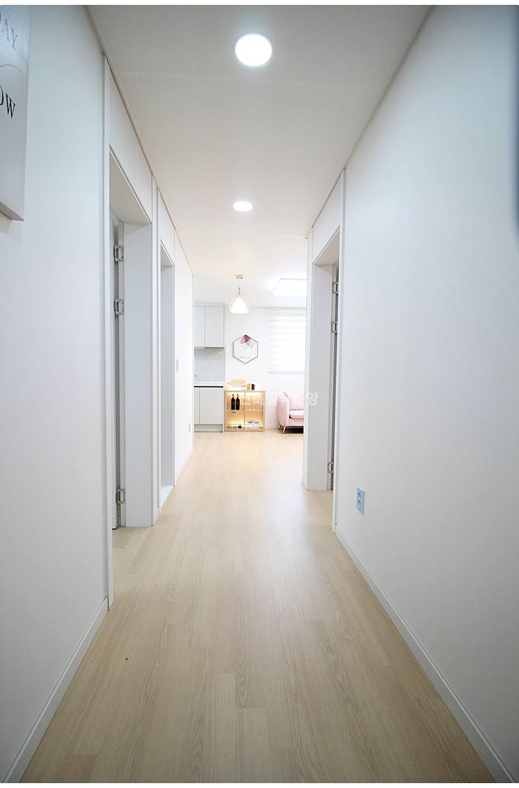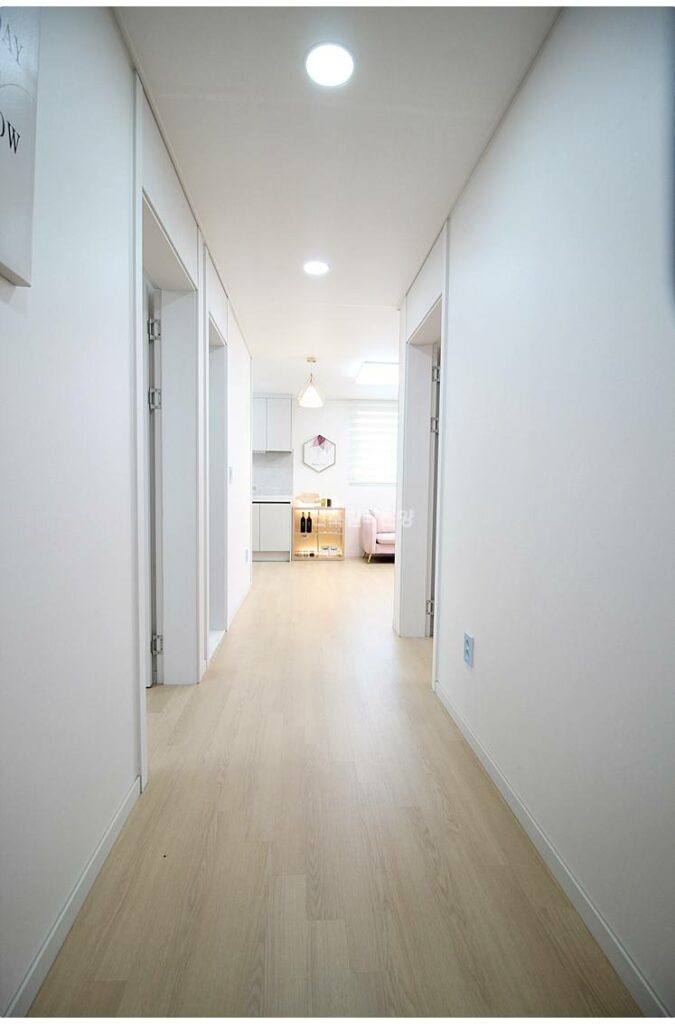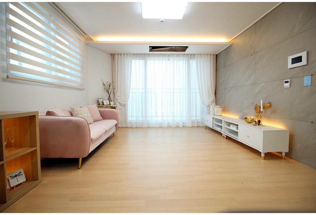 거실은 따뜻한 분위기의 우드톤 강마루로 마감되어 있으며, 라인 조명이 설치되어 은은한 무드를 연출합니다. 천장에는 시스템 에어컨이 기본 옵션으로 포함되어 냉난방 비용 부담을 줄일 수 있습니다. 주방은 ㄱ자 형태로 효율적으로 설계되었고, 냉장고 공간이 별도로 확보되어 있습니다. 주방 인접 공간에 다용도실이 배치되어 수납 공간 활용도가 높습니다.