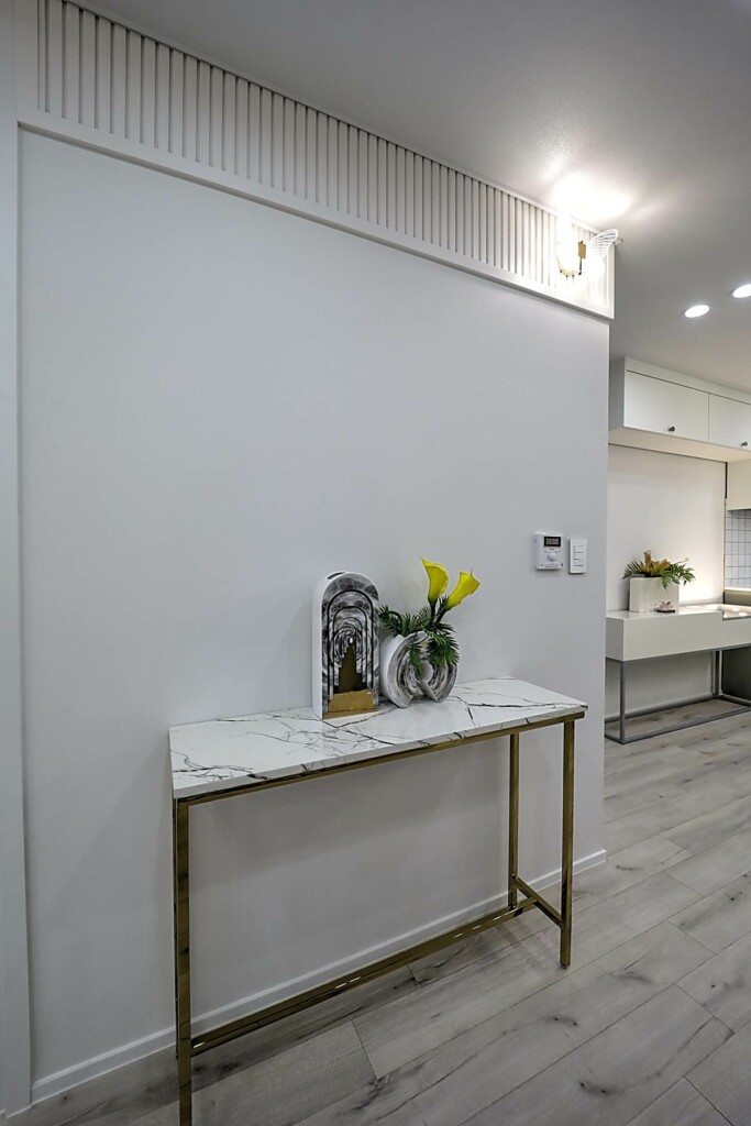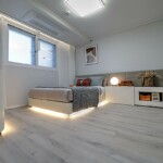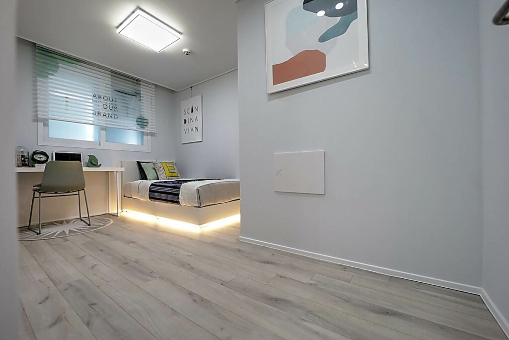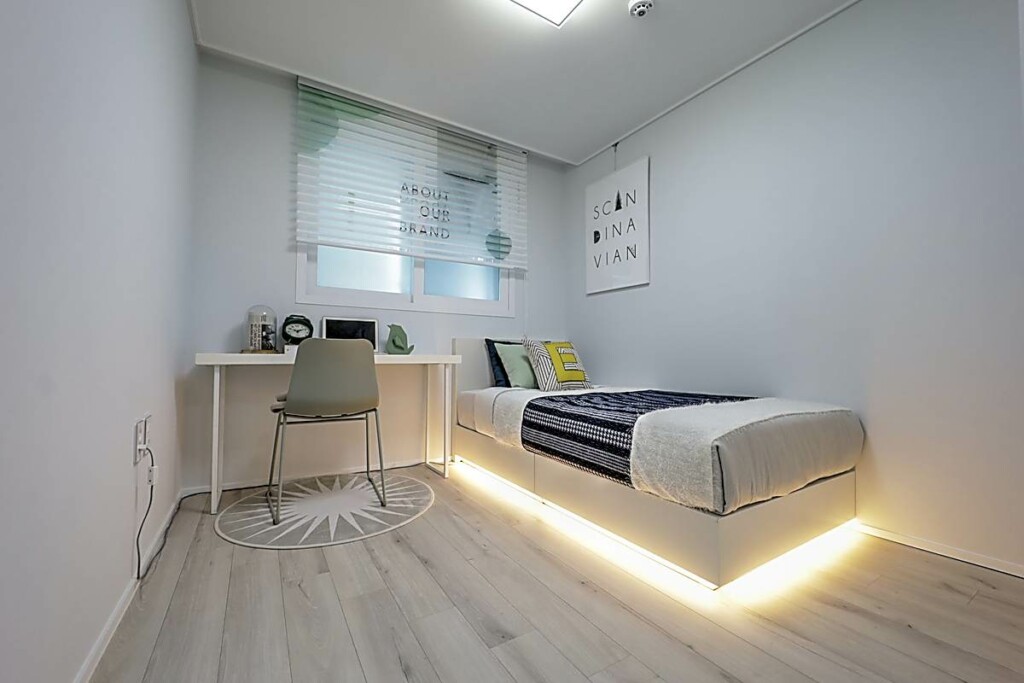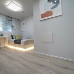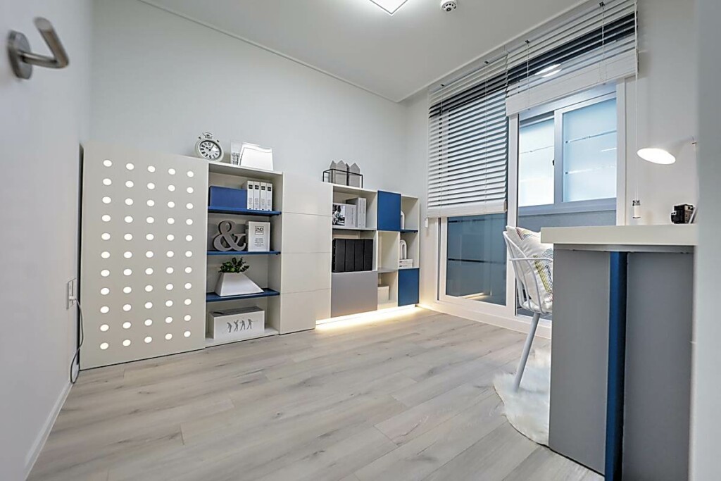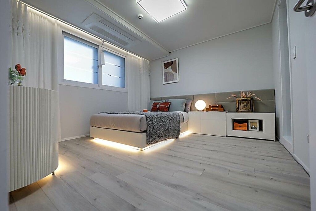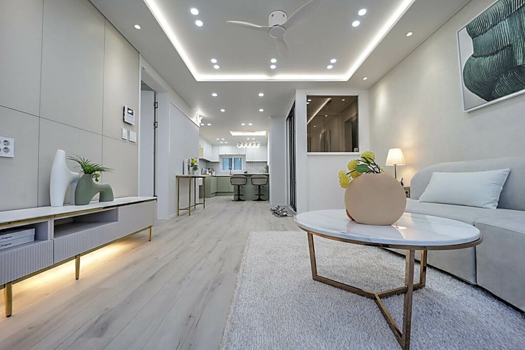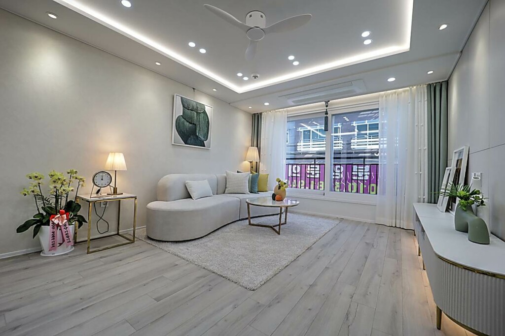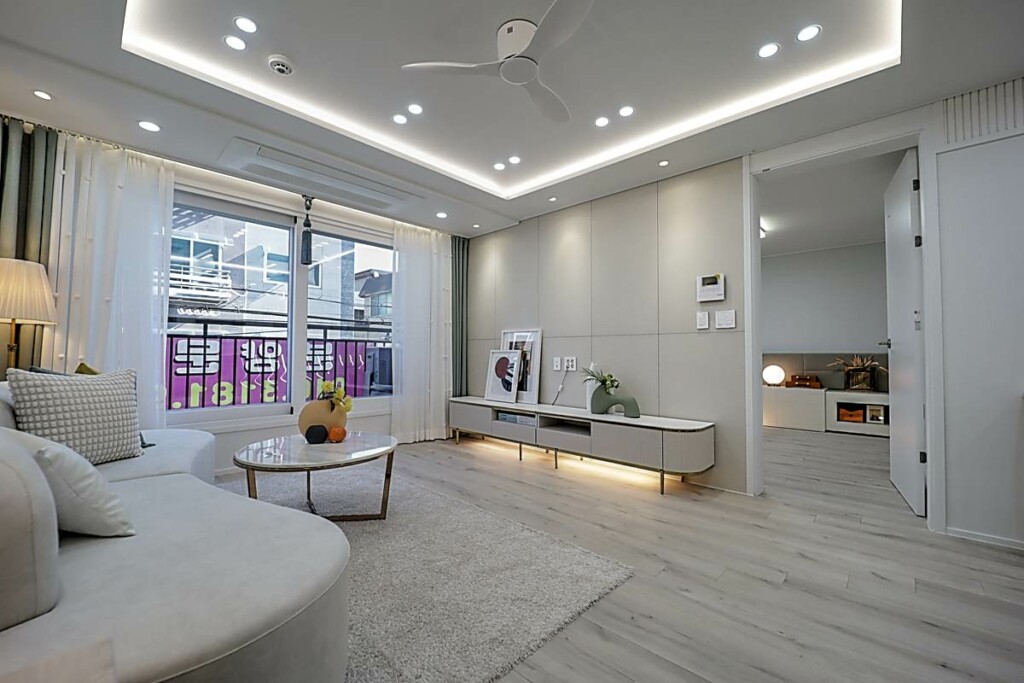 안산신축빌라 우드 아이보리톤의 세련된 인테리어가 적용되었으며, 광폭 포세린 타일과 우드 마루가 시공되어 있습니다. 거실은 4인용 소파와 TV를 여유롭게 배치할 수 있는 넉넉한 면적을 자랑합니다. 우물형 천장에는 간접조명과 다운라이트가 설치되어 다채로운 분위기 연출이 가능합니다.