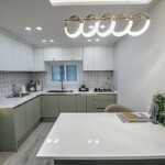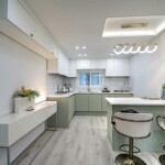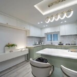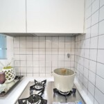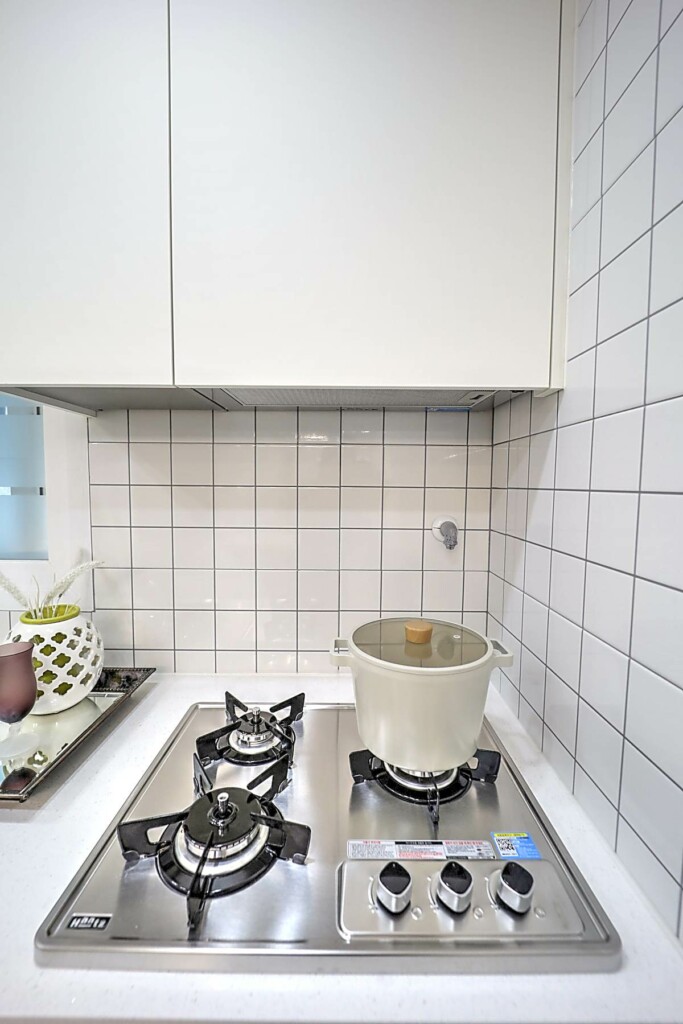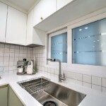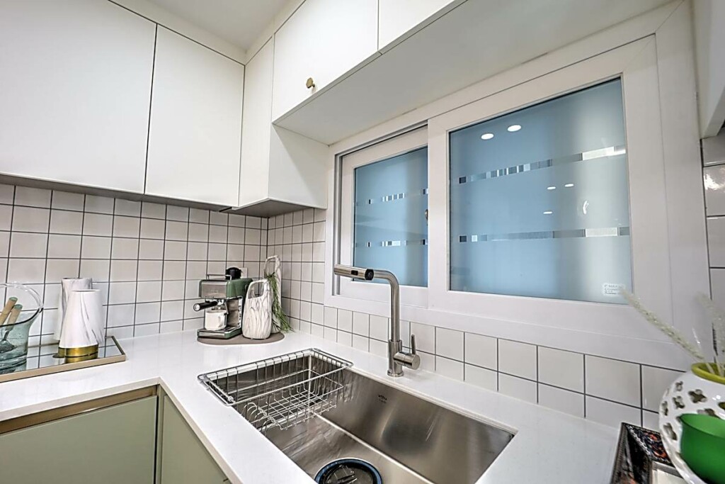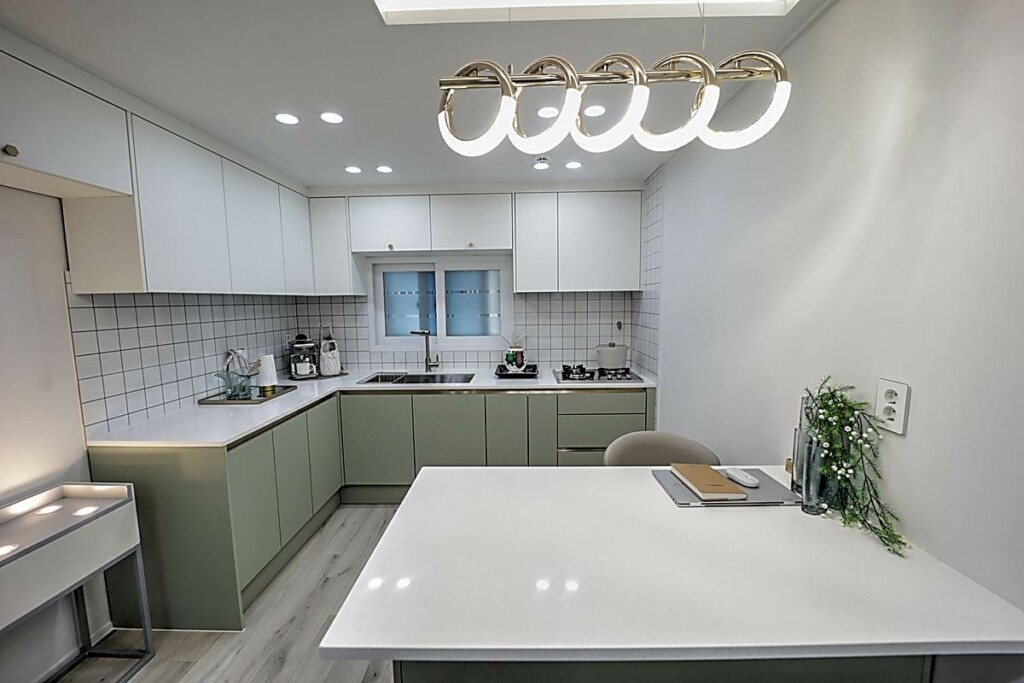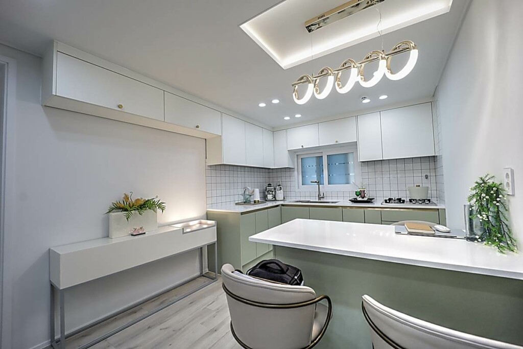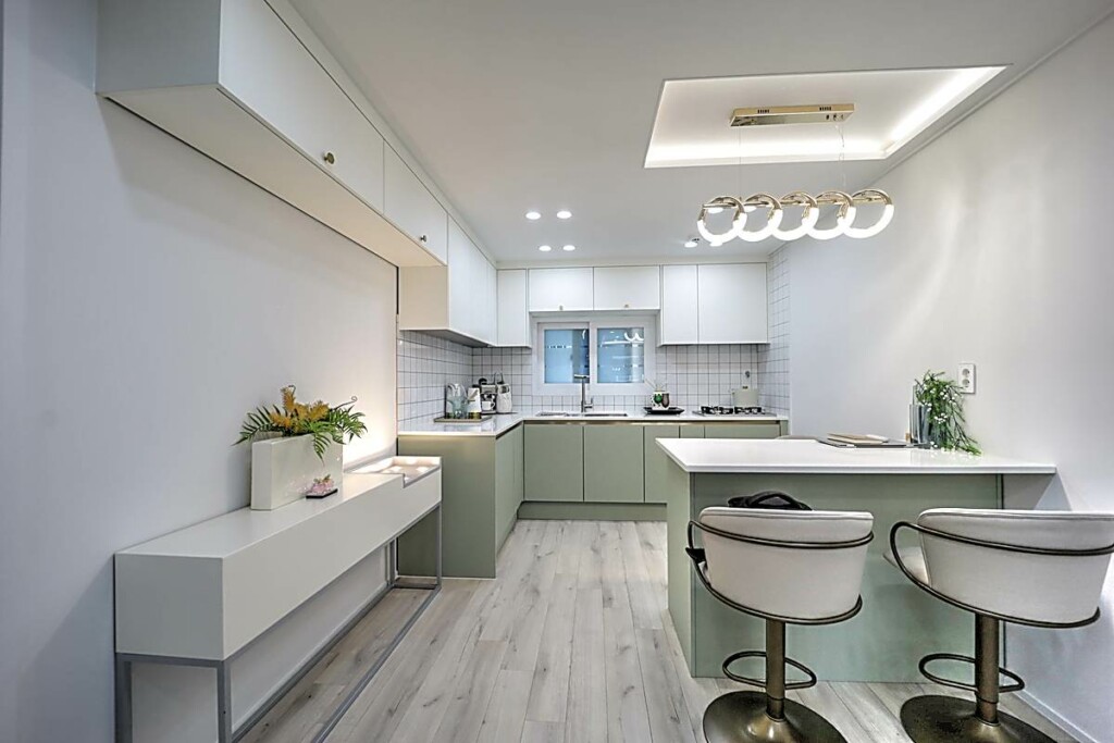 주방은 ‘ㄱ’자 형태로 설계되었으며, 아일랜드 식탁이 별도로 배치되어 있습니다. 화이트와 파스텔 그린 컬러의 수납장, 모자이크 타일 벽면이 레트로 감성을 더합니다. 시스템 에어컨 2대와 실링팬이 기본 옵션으로 제공되어 사계절 쾌적한 실내 환경을 유지할 수 있습니다.