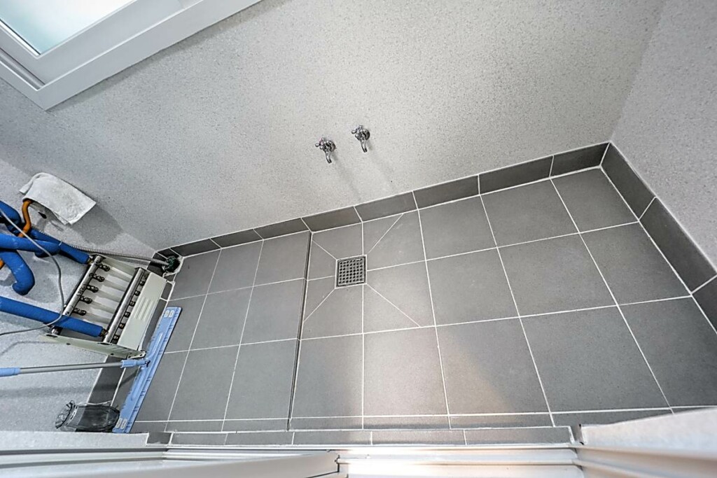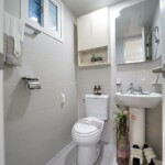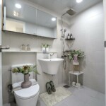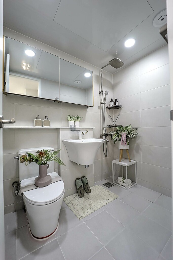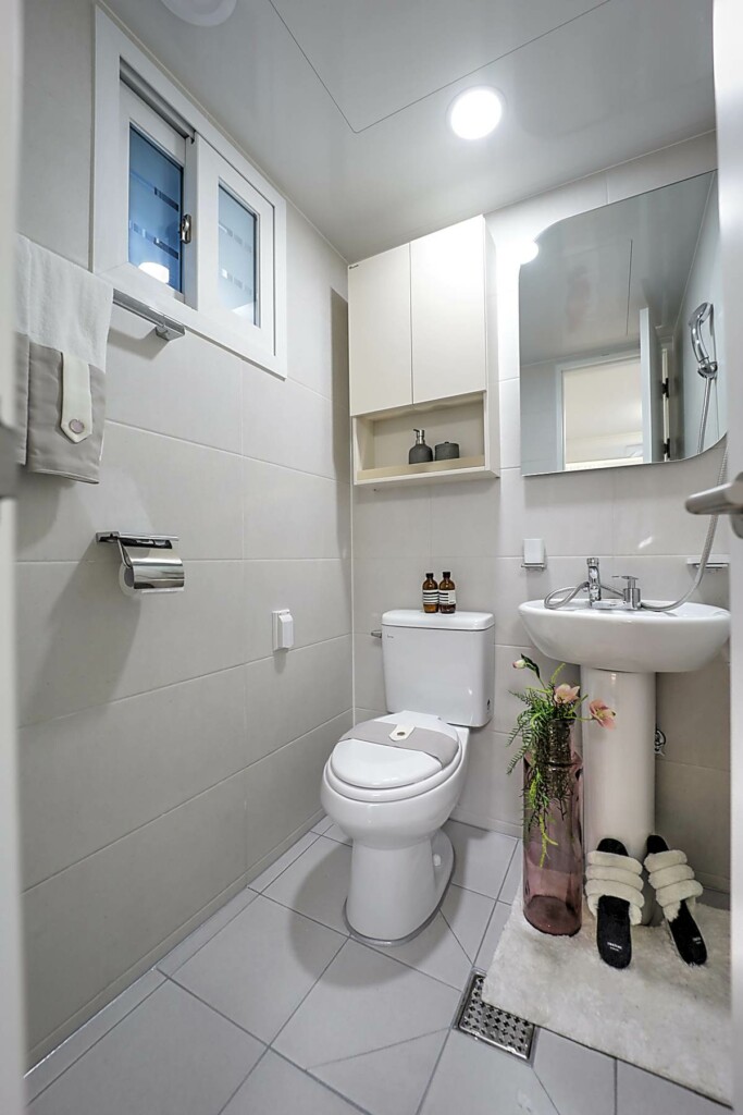 메인 욕실은 샤워 공간이 확보되어 있고, 그레이톤 타일로 깔끔하게 마감되었습니다. 보조 욕실도 실용적으로 구성되어 있으며, 환기창이 있어 습기 관리가 용이합니다. 발코니에는 세탁기와 건조기를 나란히 둘 수 있어 가사 동선이 효율적입니다.