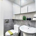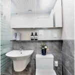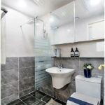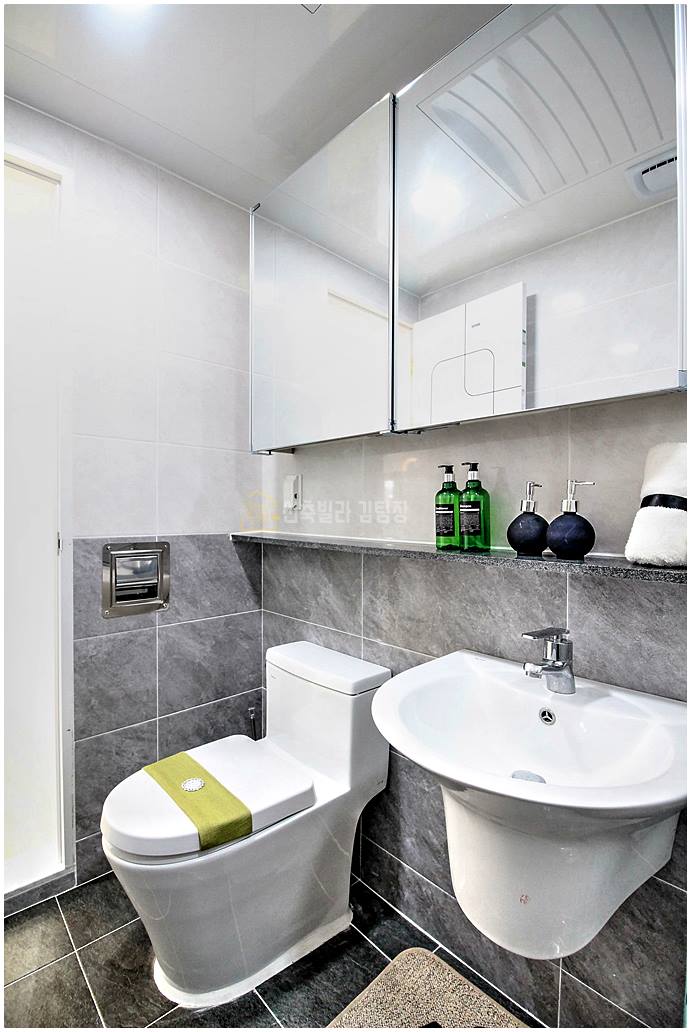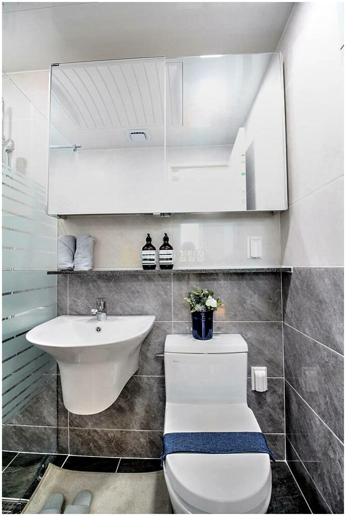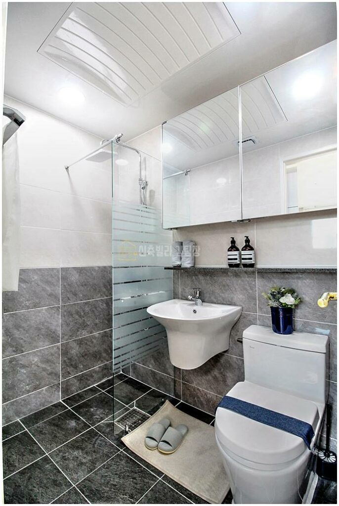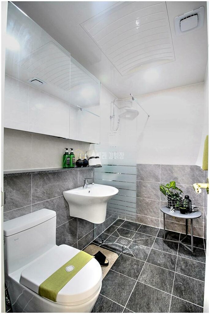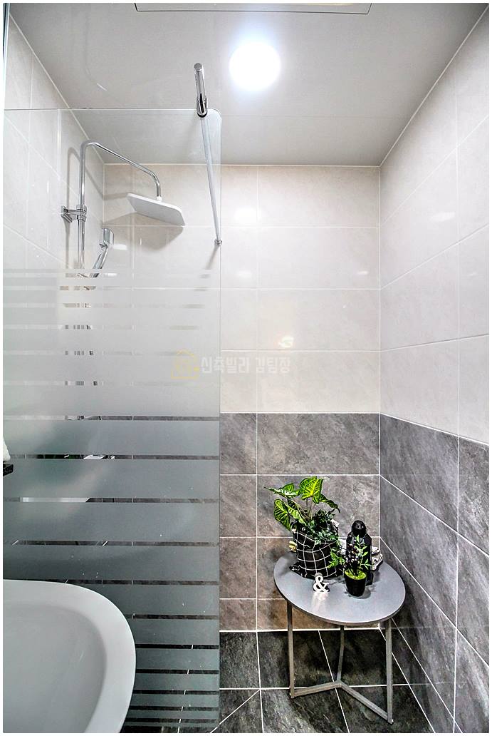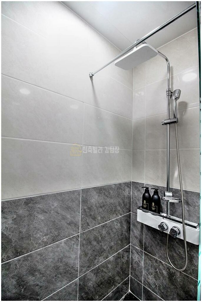 메인 욕실과 보조 욕실 모두 동일하게 넉넉한 크기로 설계되었으며, 샤워 공간이 분리되어 있습니다. 🚿 벽면은 투톤 타일로 마감해 모던한 분위기를 연출했고, 수납 선반이 추가 시공되어 욕실 용품 정리가 편리합니다.