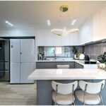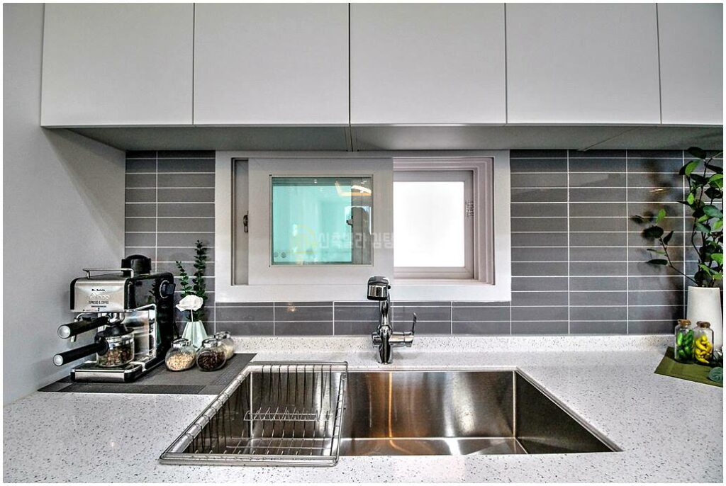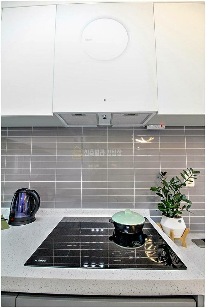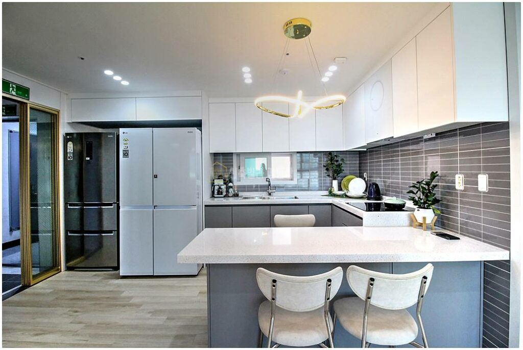 단차가 적용된 아일랜드형 식탁이 기본으로 구성되어 있어 별도의 다이닝 테이블을 둘 필요가 없습니다. 인덕션과 후드도 기본 옵션에 포함되며, 작은 창문이 설치되어 요리 중 환기도 원활합니다. 냉장고를 놓을 공간도 별도로 마련되어 있어 주방 레이아웃이 깔끔합니다. 🍳