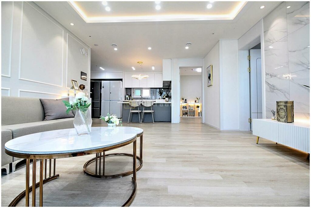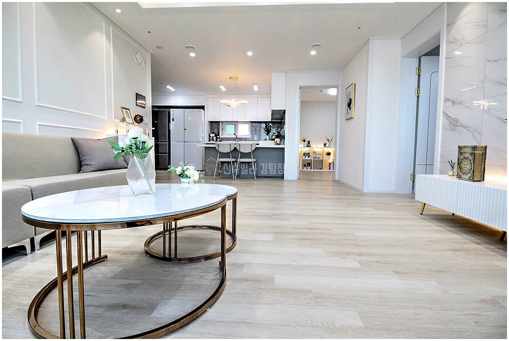 시스템 에어컨 거실·안방 설치 / 인덕션·후드 기본 제공 / 투톤 타일 욕실 마감 / 아일랜드 식탁 기본 구성 / 100% 주차 가능