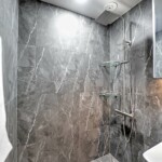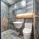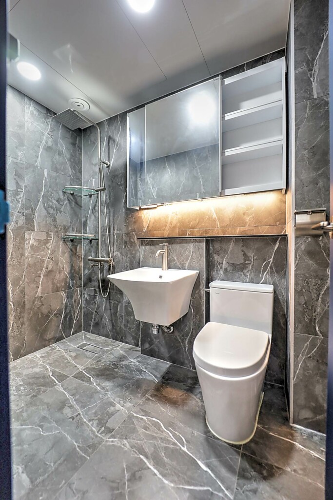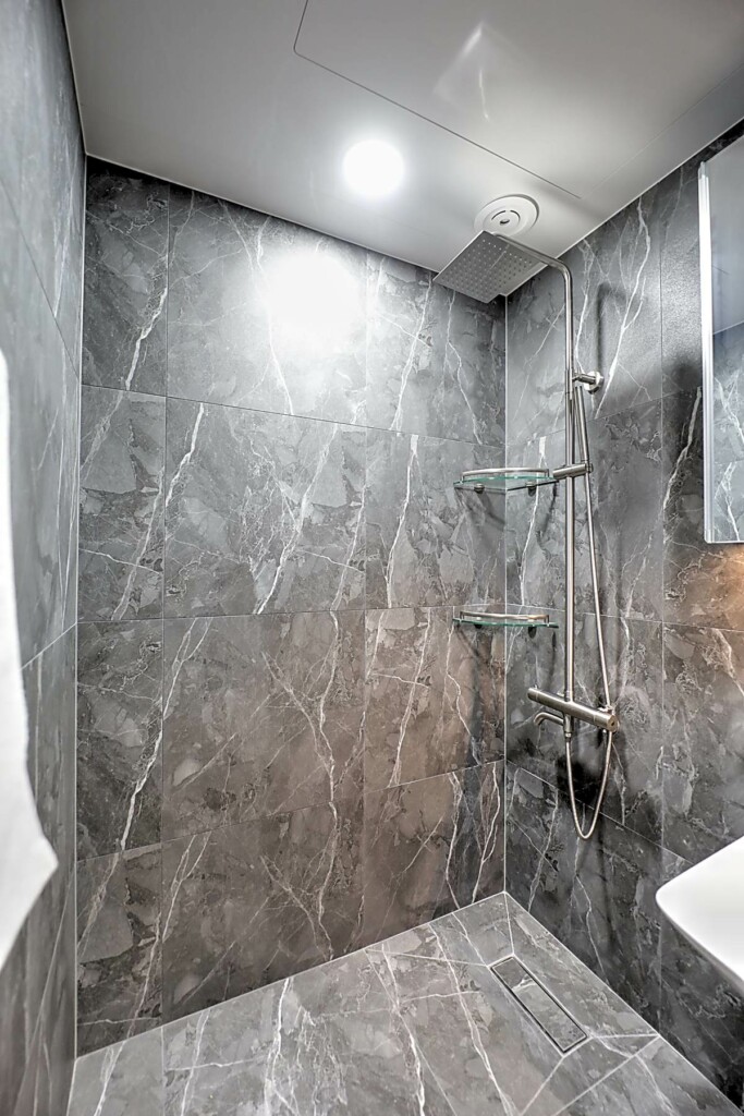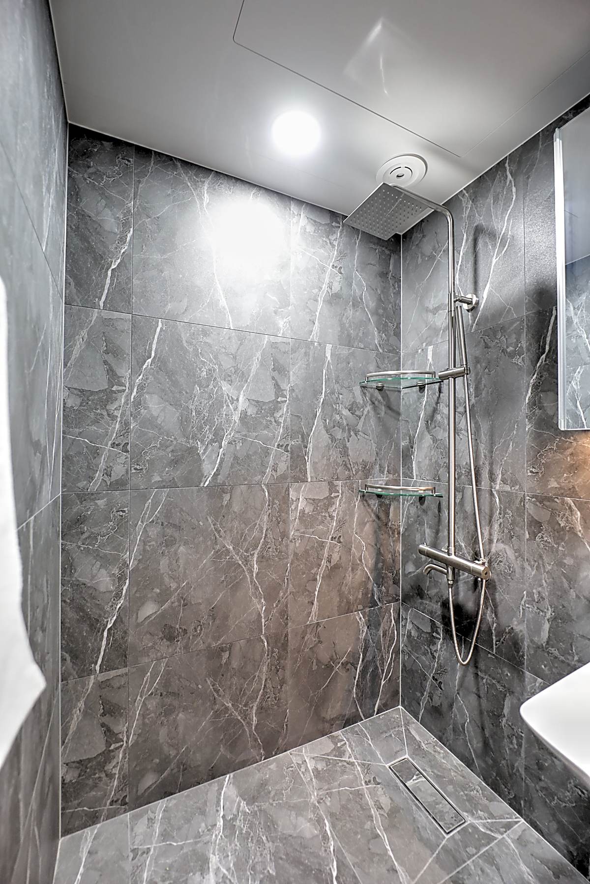 레인샤워기·수납장·젠다이 구성이 잘 갖춰져 세련된 분위기를 연출해요.