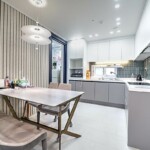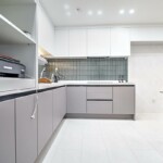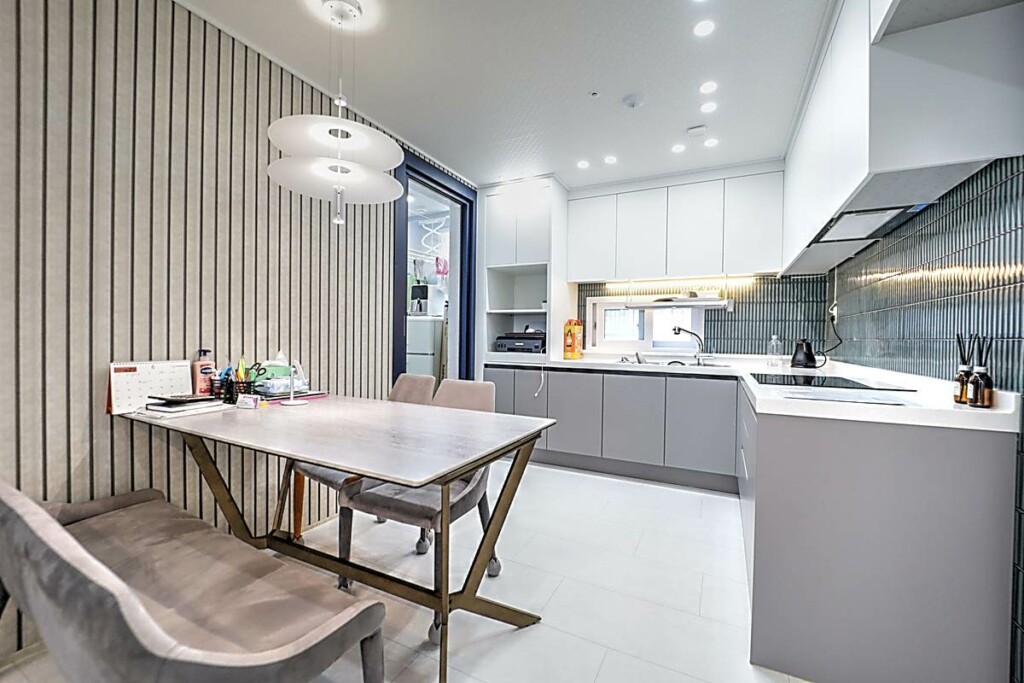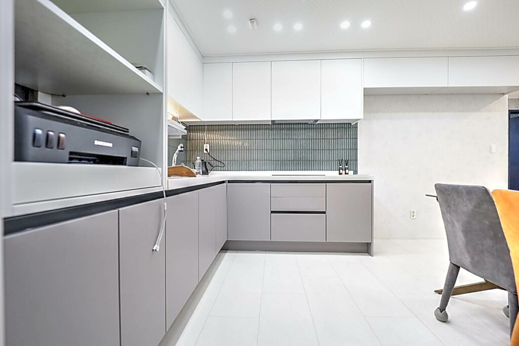 화이트 상·하부장이 조화를 이루고, 조리대도 충분하게 마련되어 있어 실용성이 높아요.