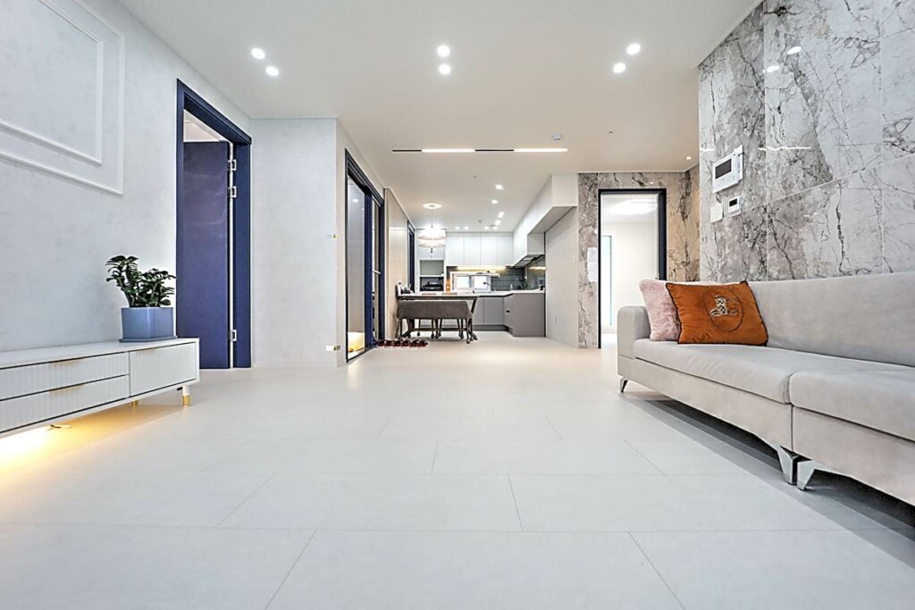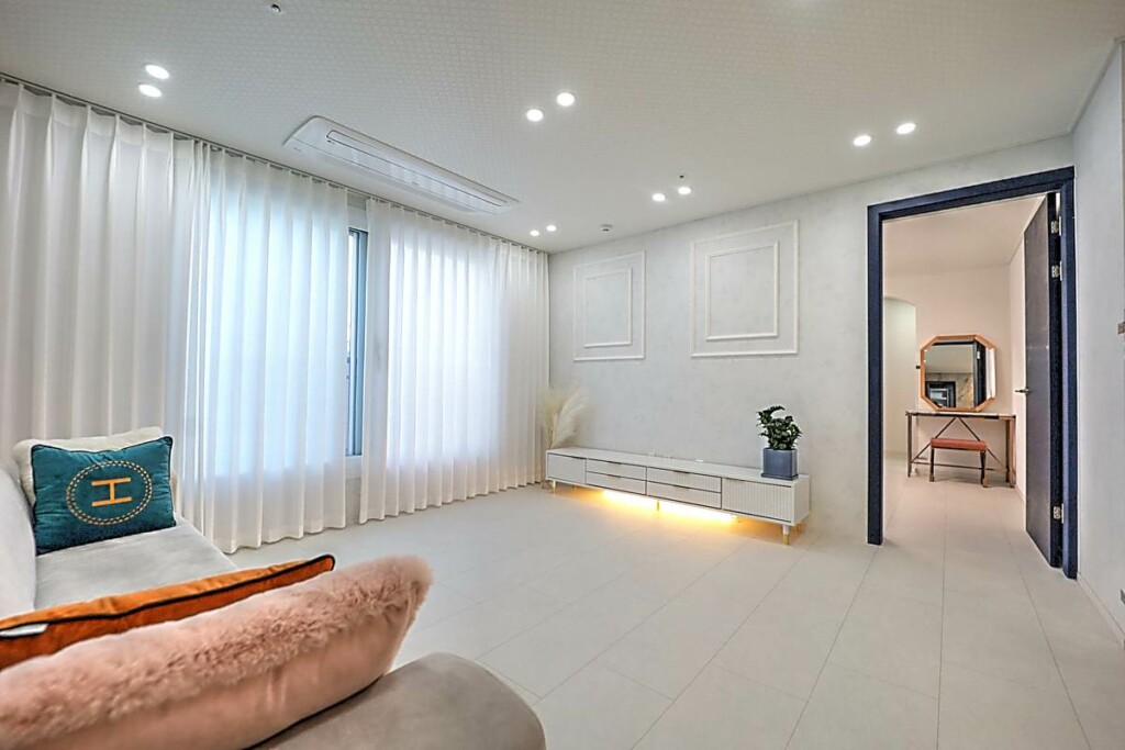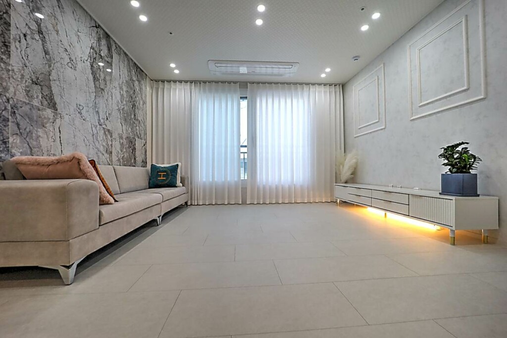 4인 소파도 자연스럽게 배치되는 넉넉한 면적이며, 시스템 에어컨이 기본 탑재되어 쾌적함을 유지하기 좋답니다.