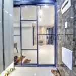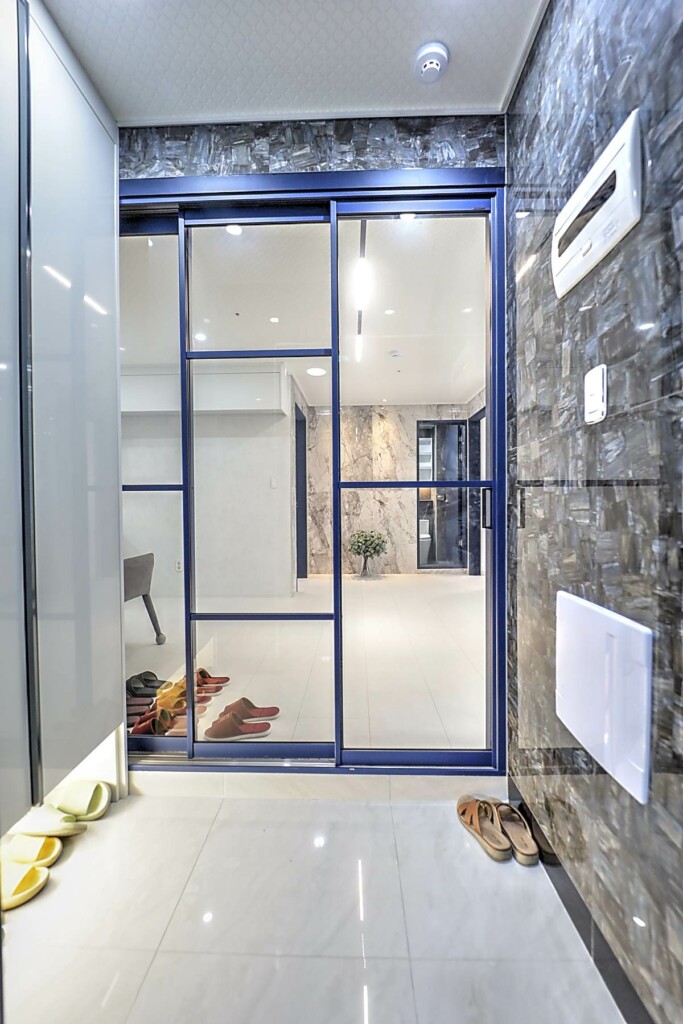 현관에는 넉넉한 신발장이 마련되어 있고 블루 포인트 컬러의 3연동 중문이 인상적이에요.
