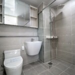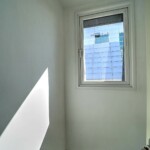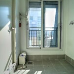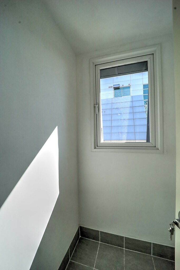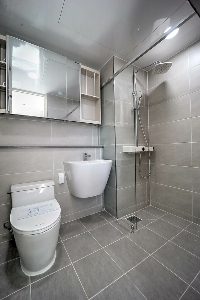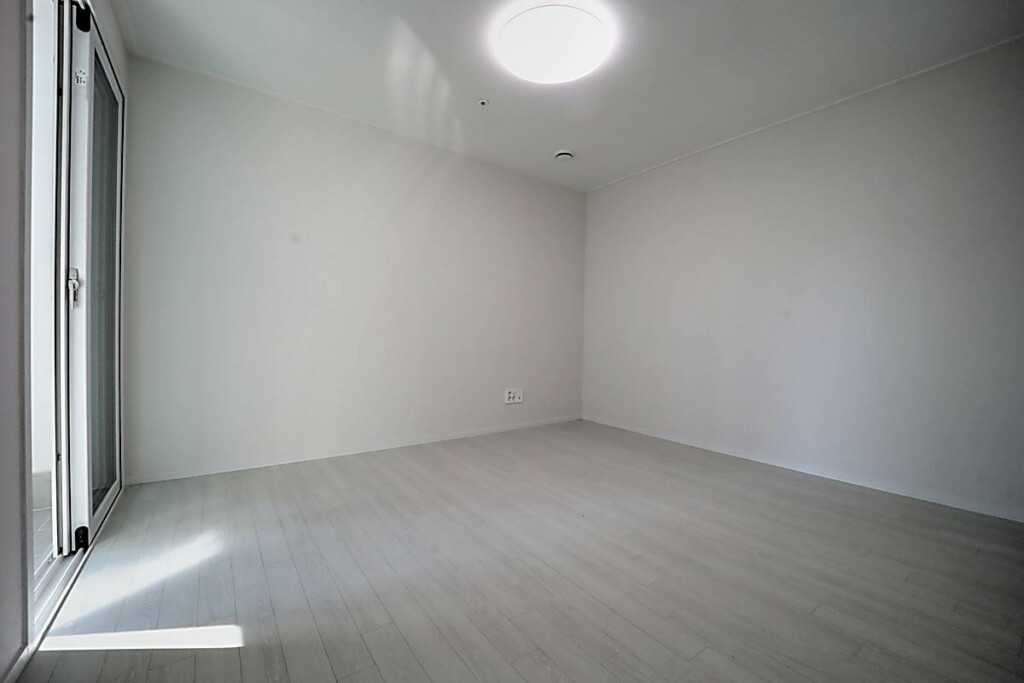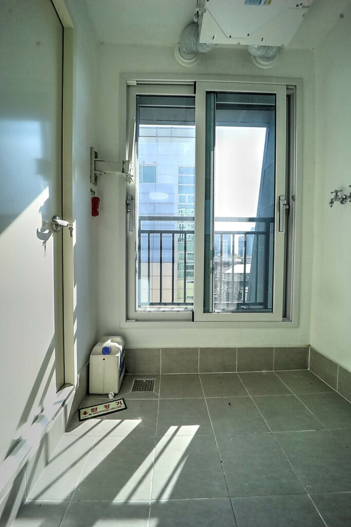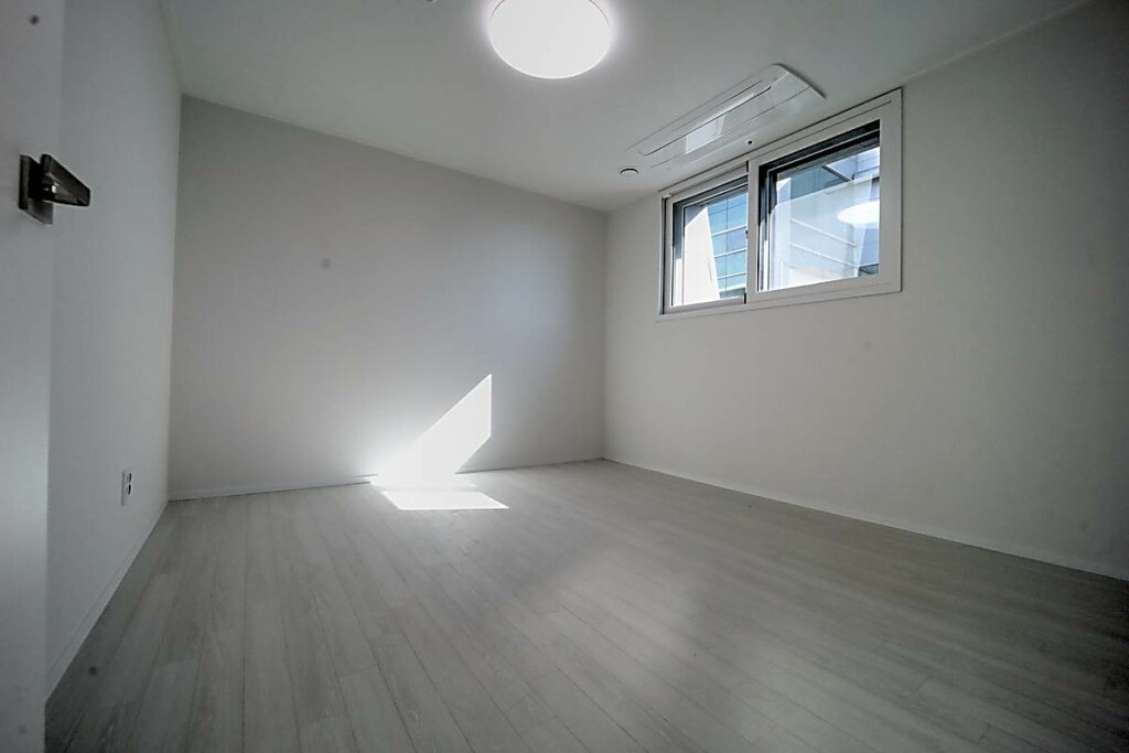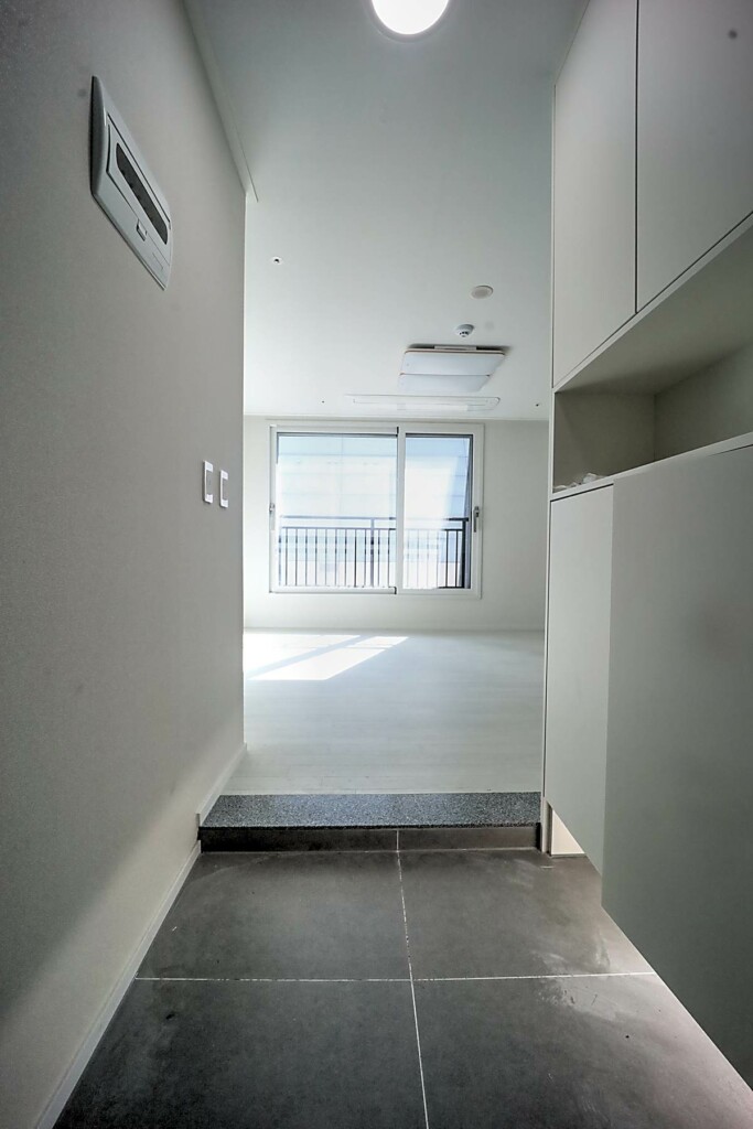 침실은 퀸 사이즈 침대를 놓아도 무리가 없는 공간감을 확보했고, 창호 설계를 통해 외부 소음을 줄이는 데 신경 쓴 모습입니다. 욕실은 모던한 타일과 해바라기 수전이 설치된 샤워 부스를 갖추고 있어, 건식·습식 구분이 명확하고 관리가 수월합니다. 다용도실과 세탁실은 수전 설치와 함께 채광이 좋아 빨래 건조와 수납 활용도가 높으며, 전실에는 상·하부로 나뉜 신발장이 배치되어 있어 수납을 정돈하기 용이합니다. 모든 세대는 별도의 중문을 시공해야 완성되는 구조라는 점도 함께 체크할 포인트입니다.