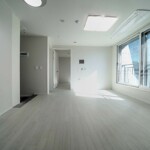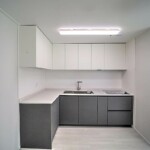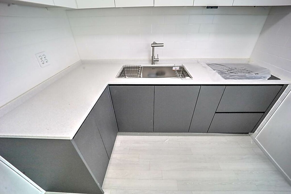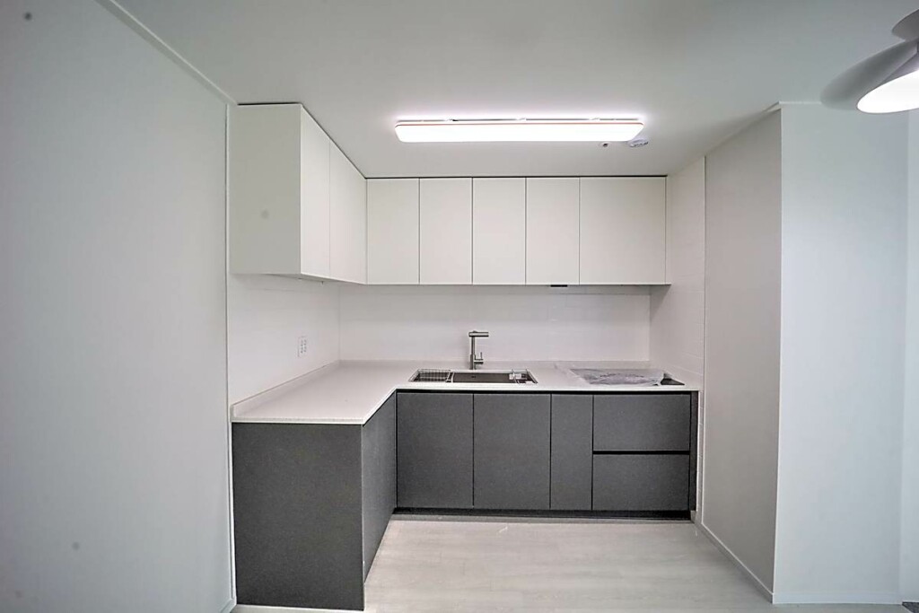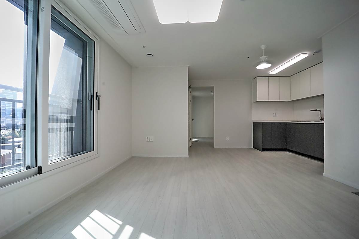 투룸 기준 타입은 방 2개와 욕실 1개, 약 18평으로 설계되어 있으며, 넓은 창을 통해 자연광이 부드럽게 들어오는 거실이 인상적입니다. 전체 마감은 뉴트럴 계열 색감으로 통일되어 어떤 가구나 인테리어 스타일도 자연스럽게 어울리며, 거실 크기 역시 여유 있는 생활이 가능한 수준으로 마감되어 있습니다. 주방은 ㄱ자 구조로 상부장과 하부장이 대비되는 톤으로 시공되어 실용성과 디자인을 동시에 잡은 강남신축투룸 구성입니다.