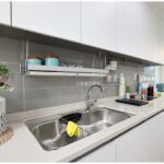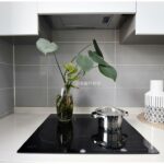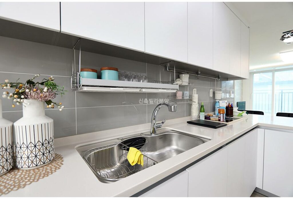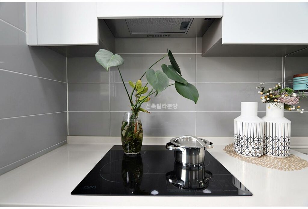 한쪽 벽면에는 시스템 창이 있어 거실 창문과 함께 열면 맞바람이 들어와 환기가 잘 됩니다. 상하부 수납장이 넉넉히 마련되어 있어 주방용품을 깔끔하게 정리할 수 있습니다. 인덕션을 사용하여 안전하고 깨끗한 조리 환경을 제공합니다.