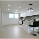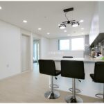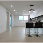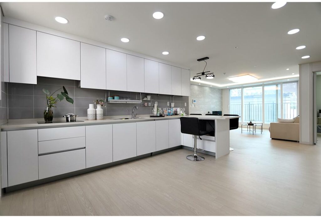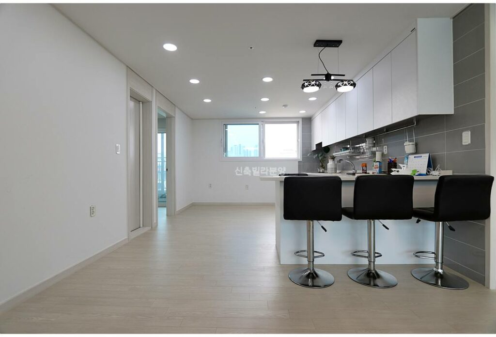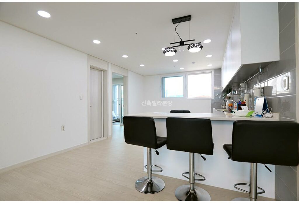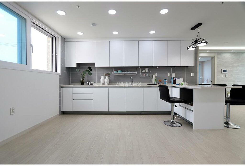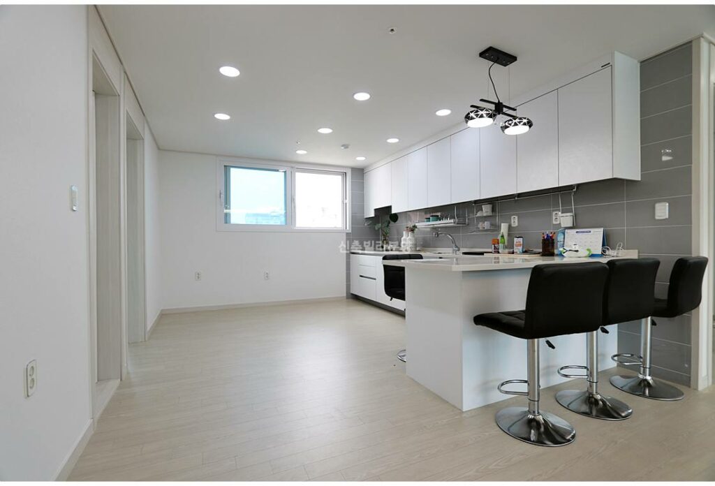 의정부신축빌라 거실만큼 넓은 부엌 공간이 이 집의 매력입니다. 기억자 구조에 아일랜드 식탁이 일자형으로 제작되어 있어 요리와 식사 준비가 효율적입니다. 냉장고를 두 대도 놓을 수 있는 여유로운 공간이 확보되어 있습니다.