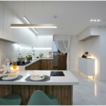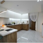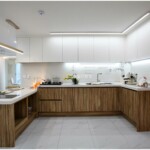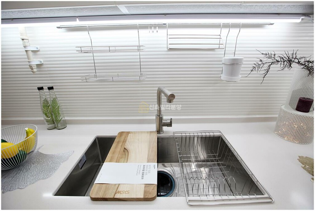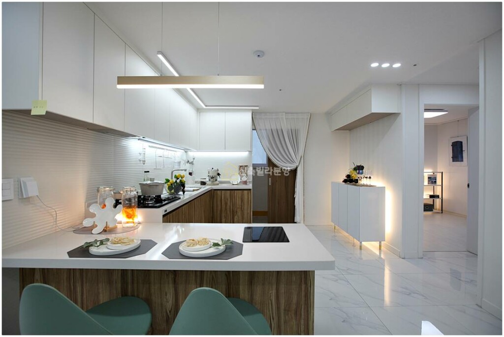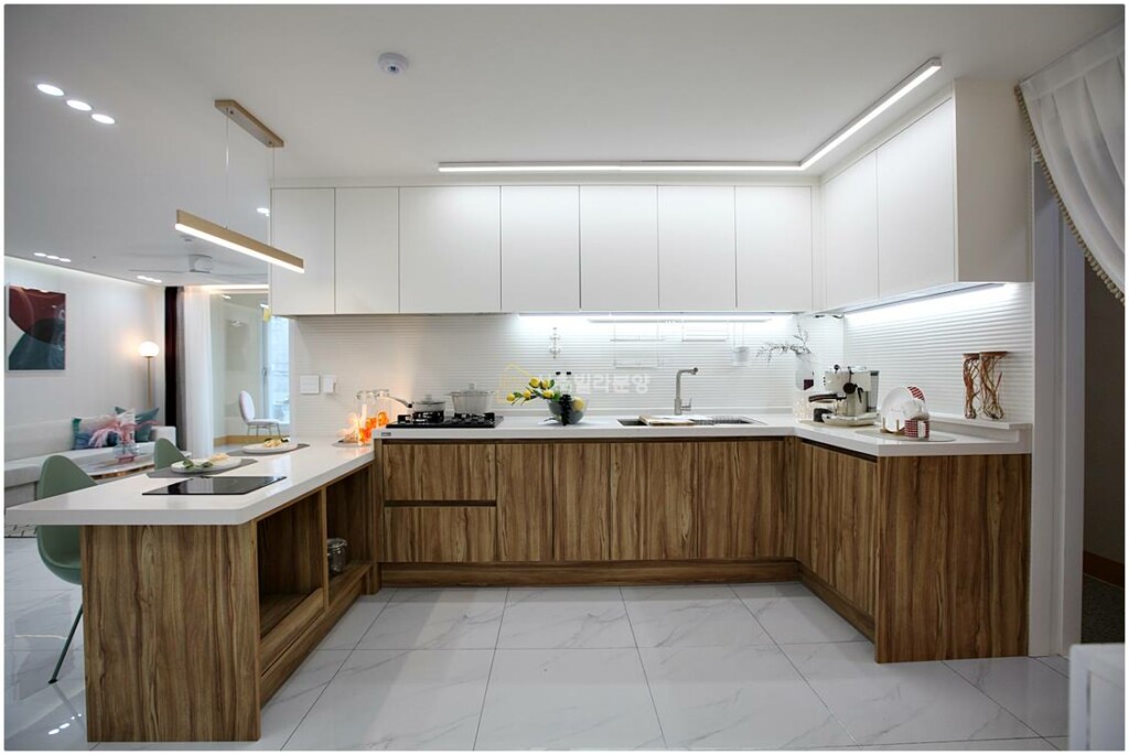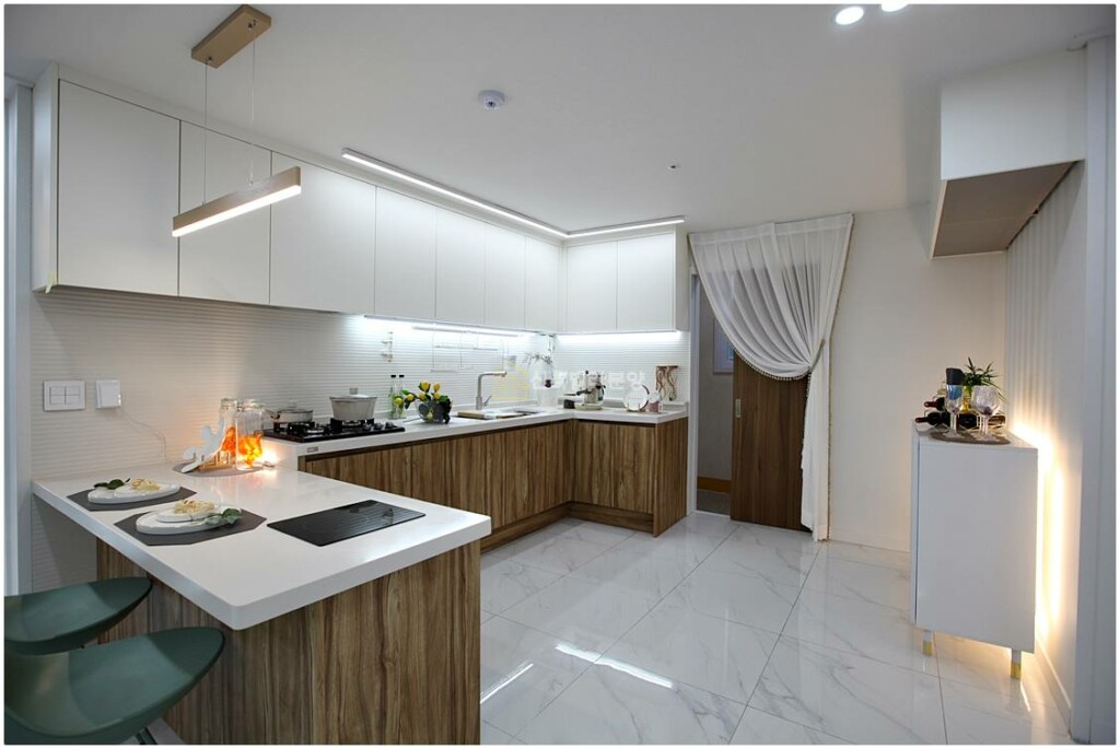 화이트&우드 컬러의 감각적인 주방가구와 디귿자 동선 구성